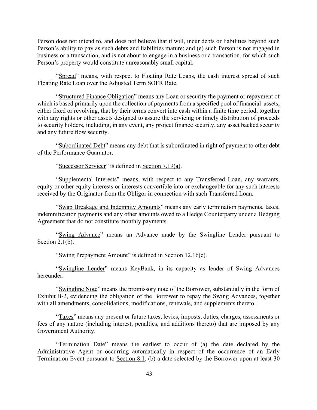 43当该等债务和负债到期时,该人不打算也不相信会产生超出该人支付能力的债务或负债;及(e)该人未从事业务或交易,且不打算从事该人的财产将构成不合理的小额资本的业务或交易。“利差”是指,就浮动利率贷款而言,此类浮动利率贷款相对于调整后期限SOFR利率的现金利差。“结构性融资义务”是指支付或偿还的任何贷款或证券,其支付或偿还主要基于从特定的固定或循环金融资产池中收取的款项,这些款项按其条款在有限的时间段内转换为现金,以及旨在确保向证券持有人提供服务或及时分配收益的任何权利或其他资产,无论如何,包括任何项目融资证券、任何资产支持证券和任何未来流动证券。“次级债”是指在受偿权上与履约保证人的其他债务发生次级关系的任何债务。“继任服务商”在第7.19(a)节中定义。“补充权益”是指,就任何转让贷款而言,任何认股权证、股权或其他可转换为或可交换为发起人从债务人收到的与该转让贷款有关的任何该等权益的股权或权益。“掉期违约和赔偿金额”是指任何提前终止付款、税款、赔偿付款以及根据对冲协议欠对冲交易对手的任何其他不构成每月付款的金额。“Swing Advance”是指Swingline贷款人根据第2.1(b)节进行的垫款。“周转预付款金额”在第12.16(e)节中定义。“Swingline Lender”意为KeyBank,其身份是本协议项下的Swing Advances贷款人。“Swingline Note”是指借款人的本票,基本上以附件 B-2的形式出现,证明借款人偿还Swing垫款的义务,连同对其的所有修订、合并、修改、续期和补充。“税”是指任何政府当局目前或未来征收的任何性质(包括利息、罚款和附加)的税、征费、征费、关税、收费、评估或费用。“终止日期”是指(a)行政代理人根据第8.1节就提前终止事件的发生而宣布或自动发生的日期中最早发生的日期,(b)借款人至少在30日选定的日期