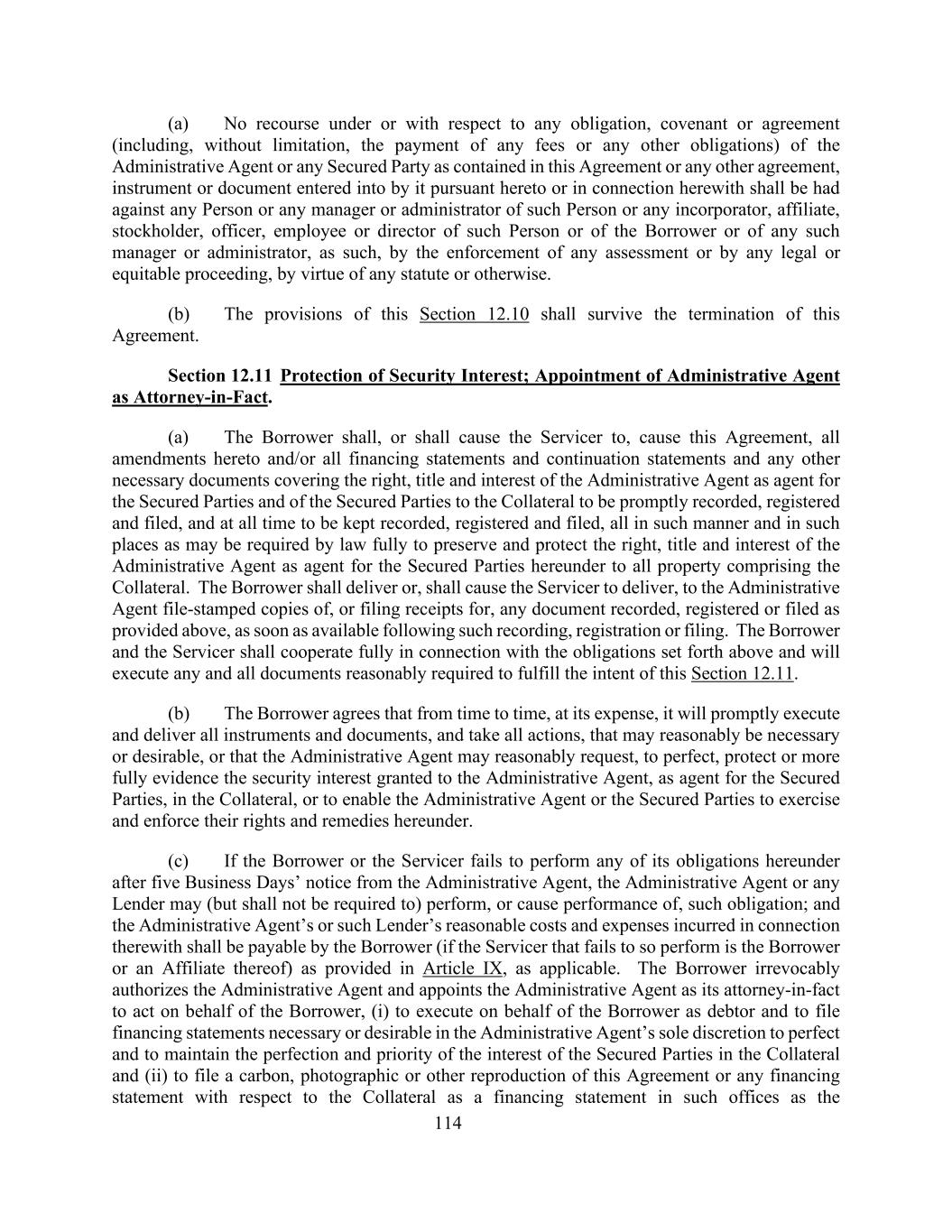 114(a)不得根据或就本协议或其依据本协议订立或与本协议有关的任何其他协议、文书或文件所载的行政代理人或任何有担保方的任何义务、契诺或协议(包括但不限于支付任何费用或任何其他义务)对任何人或该人的任何经理或管理人或该人或该借款人或任何该经理或管理人的任何公司、关联公司、股东、高级职员、雇员或董事(如通过强制执行任何评估或通过任何法律或衡平法程序,凭借任何法规或其他方式。(b)本条第12.10款的规定在本协议终止后仍然有效。第12.11节担保权益保护;指定行政代理人为实际代理人。(a)借款人应或应促使服务人促使本协议、本协议的所有修订和/或所有融资报表和延续报表以及涵盖作为担保当事人的代理人的行政代理人和担保物的担保当事人的权利、所有权和利益的任何其他必要文件迅速记录、登记和归档,并在任何时候保持记录、登记和归档,所有这些都应以法律可能要求的方式和场所充分维护和保护该权利,本协议项下作为担保方代理人的行政代理人对构成担保物的全部财产的所有权和权益。借款人应在上述记录、登记或归档后尽快向行政代理人交付或应促使服务人交付按上述规定记录、登记或归档的任何文件的盖章副本或归档收据。借款人和服务人应就上述义务进行充分合作,并将执行为实现本条第12.11款的意图而合理要求的任何和所有文件。(b)借款人同意不时自费迅速签立和交付所有文书和单证,并采取合理必要或可取的一切行动,或行政代理人可合理要求、完善、保护或更充分地证明授予行政代理人作为担保方代理人在担保物上的担保权益,或使行政代理人或担保方能够行使和强制执行其在本协议项下的权利和补救办法。(c)如借款人或服务人在行政代理人发出五个营业日的通知后仍未履行其在本协议项下的任何义务,则行政代理人或任何贷款人可(但不得被要求)履行或促使履行该义务;而行政代理人或该贷款人因此而招致的合理费用及开支,须由借款人(如未能如此履行的服务人是借款人或其附属公司)按适用的第九条规定支付。借款人不可撤销地授权行政代理人并指定行政代理人作为其事实上的代理人代表借款人行事,(i)作为债务人代表借款人执行,并提交必要或可取的融资报表,由行政代理人全权酌情决定,以完善和维护担保方在担保物上的利益的完善性和优先权,以及(ii)将本协议或与担保物有关的任何融资报表的碳复制品、照片或其他复制品作为融资报表在诸如