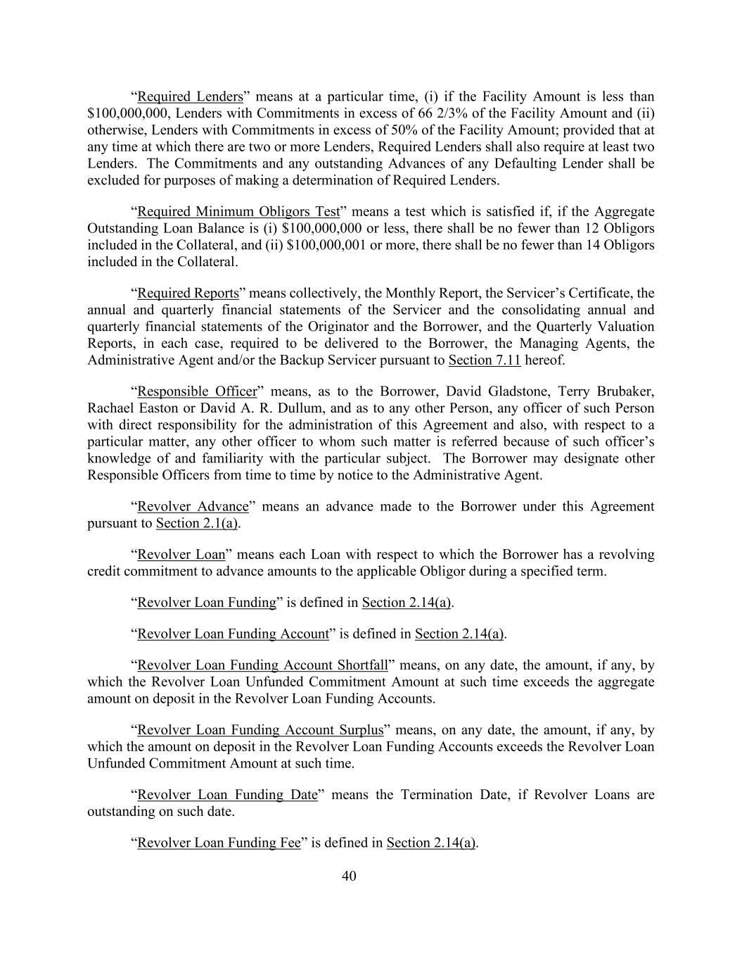 40“所需贷款人”是指在特定时间,(i)如果融资金额低于100,000,000美元,承诺金额超过融资金额662/3%的贷款人,以及(ii)否则,承诺金额超过融资金额50%的贷款人;但在有两个或更多贷款人的任何时间,所需贷款人也应要求至少两个贷款人。为确定所需贷款人,应排除任何违约贷款人的承诺和任何未偿还的预付款。“必要的最低债务人测试”是指,如果未偿贷款余额总额为(i)100,000,000美元或以下,抵押品中应包括不少于12名债务人,而(ii)100,000,001美元或以上,抵押品中应包括不少于14名债务人,则满足的测试。“必要报告”是指根据本协议第7.11节要求交付给借款人、管理代理、行政代理和/或备用服务商的每月报告、服务商证书、服务商的年度和季度财务报表以及发起人和借款人的合并年度和季度财务报表,以及季度估值报告的统称。“负责人员”是指,就借款人而言,David Gladstone、Terry L. Brubaker、Rachael Easton或David A. R. Dullum,就任何其他人而言,该人对本协议的管理负有直接责任的任何高级职员,以及就特定事项而言,因该人员了解并熟悉特定主题而被转介给该人员的任何其他高级职员。借款人可以不定期向行政代理人发出通知指定其他负责人员。“Revolver Advance”是指根据第2.1(a)节根据本协议向借款人提供的预付款。“循环贷款”是指借款人有循环信贷承诺的每笔贷款,用于在特定期限内向适用的债务人垫付金额。“循环贷款资金”的定义见第2.14(a)节。“循环贷款资金账户”在第2.14(a)节中定义。“Revolver Loan Funding Account Shortfall”是指,在任何日期,Revolver Loan Unfunded Commitment Amount at that time超过Revolver Loan Funding Accounts中存款总额的金额(如果有的话)。“循环贷款资金账户盈余”是指,在任何日期,循环贷款资金账户中的存款金额超过该时间的循环贷款无资金承诺金额的金额(如有)。“循环贷款融资日期”是指终止日期,如果循环贷款在该日期未偿还。“循环贷款资金费用”在第2.14(a)节中定义。