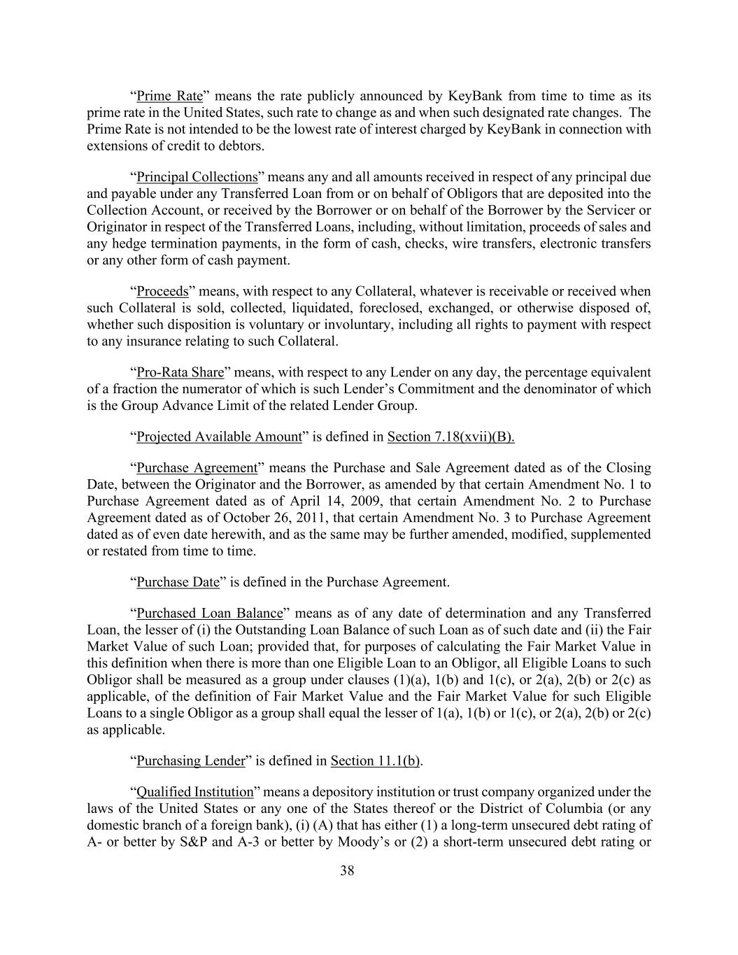 38“最优惠利率”是指KeyBank不时公开宣布的利率,作为其在美国的最优惠利率,该利率将在该指定利率发生变化时发生变化。Prime Rate并非KeyBank就向债务人提供信贷而收取的最低利率。“本金催收”是指从或代表债务人存入催收账户的任何转让贷款项下到期应付的任何本金所收到的任何和所有金额,或由借款人或由服务商或发起人就转让贷款所代表借款人收到的任何和所有金额,包括但不限于销售收益和任何对冲终止付款,形式为现金、支票、电汇、电子转账或任何其他形式的现金支付。“收益”是指,就任何抵押品而言,在此类抵押品被出售、收取、清算、取消赎回权、交换或以其他方式处置时,无论此类处置是自愿的还是非自愿的,应收或收到的任何款项,包括与此类抵押品相关的任何保险的所有付款权利。“按比例份额”是指,就任何贷款人而言,在任何一天,其分子为该贷款人承诺且其分母为相关贷款人集团的集团垫付限额的零头的百分比等值。“预计可用金额”在第7.18(xvii)(b)节中定义。「购买协议」指发起人与借款人于截止日期订立的买卖协议,经日期为2009年4月14日的购买协议的第1号修订、日期为2011年10月26日的购买协议的第2号修订、日期为偶数日期的购买协议的第3号修订,以及作为同一修订,可不时进一步修订、修订、补充或重述。购买协议中定义了“购买日期”。“所购贷款余额”是指截至任何确定日期和任何转让的贷款,(i)截至该日期该贷款的未偿还贷款余额和(ii)该贷款的公平市场价值两者中的较低者;但为计算本定义中的公平市场价值,当向债务人提供不止一笔合格贷款时,向该债务人提供的所有合格贷款应按照第(1)(a)、1(b)和1(c)条或适用的2(a)、2(b)或2(c)条作为一组计量,向作为一个集团的单一债务人提供的此类合格贷款的公平市场价值的定义和公平市场价值应等于1(a)、1(b)或1(c),或2(a)、2(b)或2(c)中的较低者(如适用)。第11.1(b)节对“采购贷款人”进行了定义。“合格机构”是指根据美国或其任何一国或哥伦比亚特区法律组建的存款机构或信托公司(或外国银行的任何国内分支机构),(i)(a)具有(1)标普 A-或更好的长期无担保债务评级和穆迪A-3或更好的或(2)短期无担保债务评级或