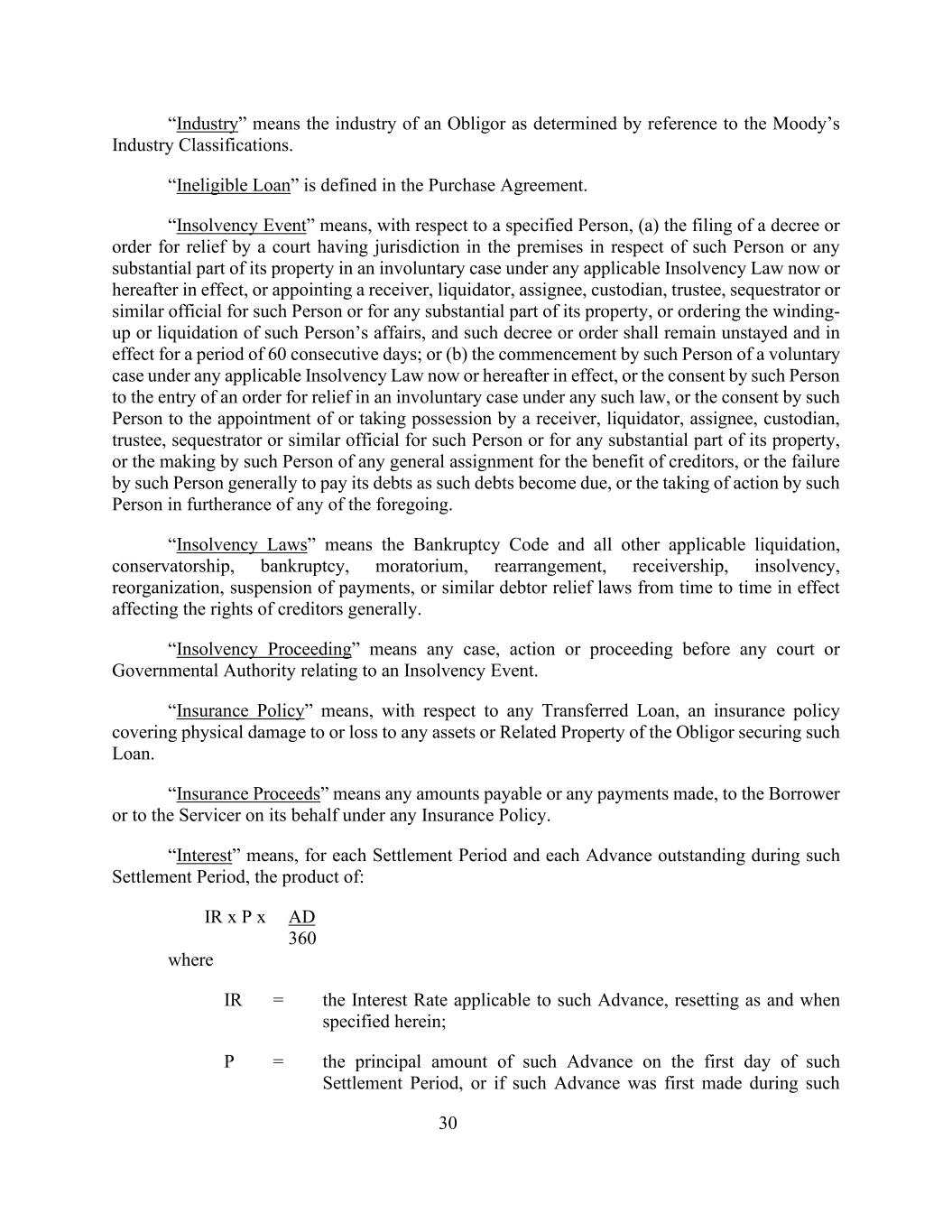 30“行业”是指参照穆迪行业分类确定的债务人的行业。购买协议中定义了“不合格贷款”。“破产事件”是指,就某特定人士而言,(a)根据现行或以后生效的任何适用的破产法,在非自愿案件中,由在处所内具有管辖权的法院就该人士或其财产的任何实质部分提出请求救济的法令或命令,或为该人士或其财产的任何实质部分指定接管人、清盘人、受让人、托管人、扣押人或类似官员,或命令对该人士的事务进行清盘或清算,而该等判令或命令须在连续60天的期间内保持不变和有效;或(b)该等人根据现时或以后生效的任何适用的破产法启动自愿案件,或该等人同意根据任何该等法律在非自愿案件中输入济助令,或该等人同意接管人、清盘人、受让人、保管人、受托人、扣押人或类似官员为该等人或其财产的任何实质部分指定或占有,或该等人为债权人的利益作出任何一般转让,或该等人一般未能在该等债务到期时偿付其债务,或该等人为促进上述任何一项而采取行动。“破产法”是指《破产法》和所有其他适用的清算、监管、破产、暂停、重新安排、接管、无力偿债、重组、暂停付款或不时生效的、普遍影响债权人权利的类似债务人救济法律。“破产程序”是指任何法院或政府当局就破产事件提起的任何案件、诉讼或程序。“保险单”是指,就任何转让的贷款而言,涵盖为此类贷款提供担保的债务人的任何资产或相关财产的物理损坏或损失的保险单。“保险收益”是指根据任何保险单向借款人或代其向服务商支付的任何应付金额或已支付的任何款项。“利息”是指,对于该结算期内的每个结算期和每笔未偿还的预付款,乘积为:IR x P x AD 360,其中IR =适用于该预付款的利率,在此处指定时重置;P =该结算期第一天该预付款的本金金额,或者如果该预付款是在该结算期内首次进行的