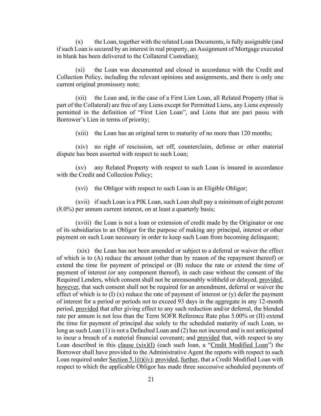 21(x)贷款连同相关贷款单据是完全可转让的(如果此类贷款以不动产权益作抵押,则空白执行的抵押转让已交付给抵押品托管人);(xi)贷款是根据信贷和催收政策(包括相关意见和转让)记录和结清的,并且只有一张当前的原始本票;(xii)贷款以及在第一留置权贷款的情况下,所有相关财产(即抵押品的一部分)除允许的留置权外没有任何留置权,“第一留置权贷款”定义中明确允许的任何留置权,以及在优先权方面与借款人的留置权同等的留置权;(xiii)贷款的原始到期期限不超过120个月;(xiv)没有就该贷款主张撤销权、抵销权、反索赔权、抗辩权或其他重大争议;(xv)与该贷款有关的任何相关财产均按照授信和催收政策投保;(xvi)与该贷款有关的债务人是合格的债务人;(xvii)如果该贷款是一笔PIK贷款,此类贷款应至少按季度支付每年至少百分之八(8.0%)的当期利息;(xviii)该贷款不是发起人或其子公司之一为取得任何本金而向债务人提供的贷款或信贷展期,为避免此类贷款拖欠所必需的此类贷款的利息或其他付款;(xix)该贷款没有被修改或受到延期或豁免,其影响是(a)减少金额(由于偿还贷款除外)或延长支付本金的时间或(b)降低利率或延长支付利息(或其任何组成部分)的时间,在每种情况下,未经所需贷款人同意,不得无理拒绝或延迟同意,但前提是,(i)(x)降低利息支付率或(y)在任何12个月期间内将利息的支付推迟一段或多段合计不超过93天的期间,但在任何此类降低和/或递延生效后,混合年利率不低于Term SOFR参考利率加上5.00%或(II)仅因该贷款的预定到期日而延长本金支付时间的修订、延期或放弃不需获得此种同意,只要此类贷款(1)不是违约贷款,且(2)未发生且预计不会发生违反重大财务契约的情况;并规定,就本条第(xix)(i)款所述的任何贷款(每一笔此类贷款,“信用修改贷款”)而言,借款人应已向行政代理人提供第5.1(t)(iv)条所要求的有关该贷款的报告;此外,条件是适用的债务人已就该贷款连续三次按计划付款的信用修改贷款