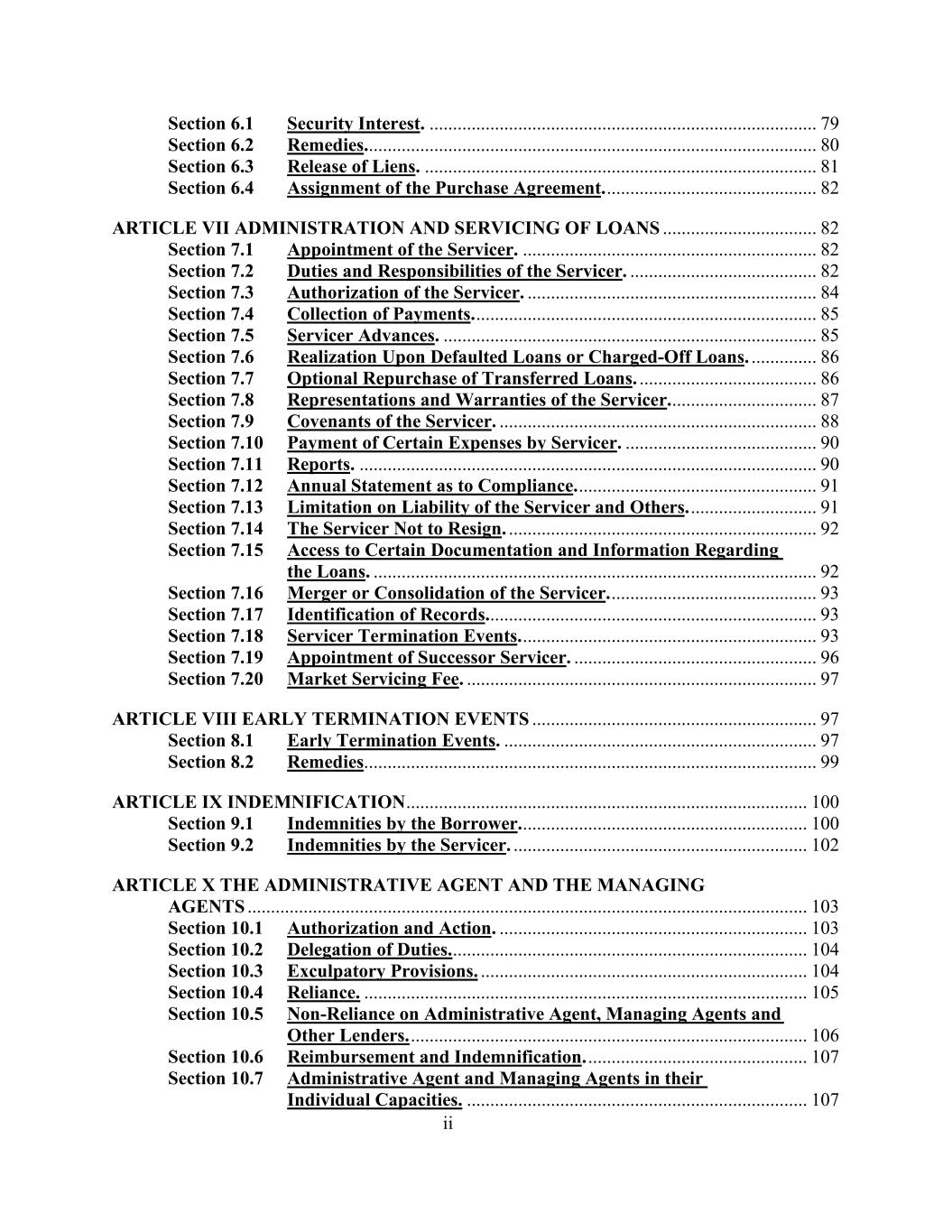 二、第6.1节担保权益。...................................................................................79第6.2节补救措施。................................................................................................80第6.3节留置权的解除。....................................................................................81采购协议第6.4节转让。.................................................82第七条贷款的管理和服务.................................82第7.1节服务人的任命。.................................................................82第7.2节服务者的义务和责任。......................................82第7.3节服务商的授权。......................................................84第7.4节收款。.....................................................................85第7.5节服务商垫款。................................................................................85第7.6节对违约贷款或已核销贷款的变现。..............86第7.7节转让贷款的可选回购。......................................86第7.8节服务商的陈述和保证。.................................87第7.9条服务人的契诺。....................................................................88第7.10节服务商支付某些费用。.......................................90第7.11节报告。..................................................................................90第7.12节关于合规性的年度声明。...................................................91第7.13节服务人及其他的责任限制。....................91第7.14节服务者不辞职。..................................................................92第7.15节查阅有关贷款的某些文件和信息。................................................................................................92第7.16节服务商的合并或合并。....................................................93第7.17节记录的识别。......................................................................93第7.18节服务器终止事件。...................................................................93第7.19节继任服务人的任命。....................................................96第7.20节市场服务费。.....................................................................97第八条提前终止事项.....................................................................97第8.1节提前终止事项。...................................................................97第8.2节补救办法。......................................................................................99第九条赔偿......................................................................................100第9.1节借款人的赔偿。.................................................................... 100第9.2节服务商的赔偿。.................................................................102第十条行政代理人和管理代理人.................................................................................................... 103第10.1节授权和行动。.................................................................... 103第10.2节职责下放。.................................................................... 104第10.3节免责条款。.................................................................... 104第10.4节依赖。.................................................................................... 105第10.5节不依赖行政代理人、经办代理人和其他出借人。.................................................................................... 106第10.6节偿还和赔偿。.................................................... 107第10.7节行政代理人和以个人身份管理的代理人。......................................................................... 107