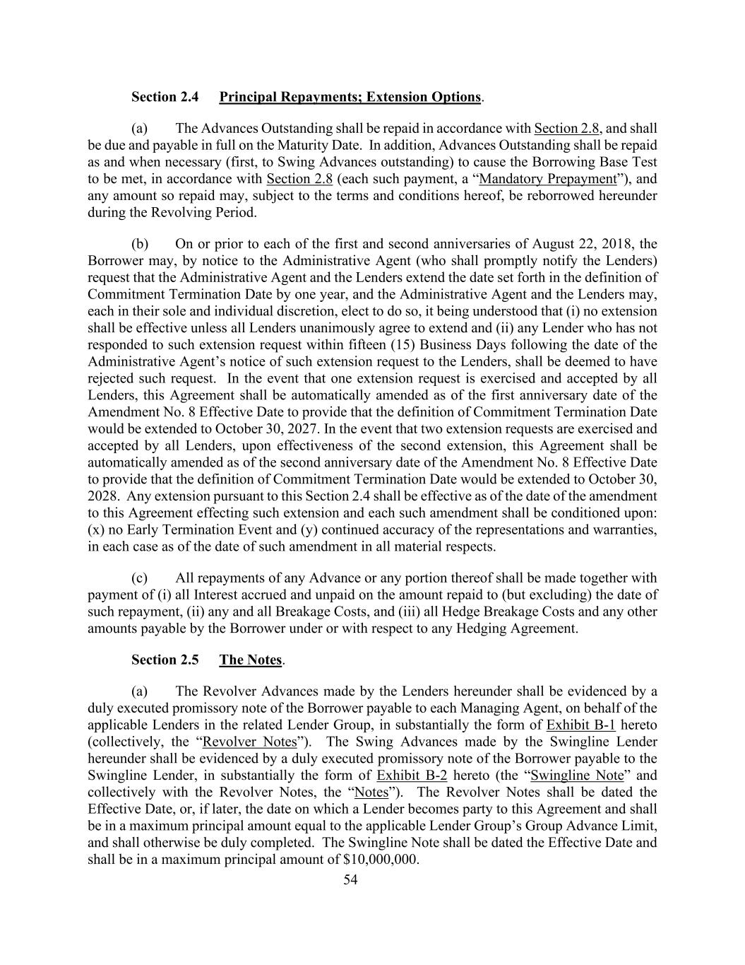 54第2.4节本金偿还;展期选择。(a)未偿还的垫款应按照第2.8节偿还,并应在到期日到期并全额支付。此外,未偿还的垫款应在必要时偿还(首先是周转未偿还的垫款),以根据第2.8节(每笔此类付款,“强制性预付款”)使借款基础测试得到满足,并且根据本协议的条款和条件,如此偿还的任何金额可在循环期内根据本协议重新借入。(b)在2018年8月22日的第一个和第二个周年纪念日或之前,借款人可向行政代理人发出通知(行政代理人应及时通知贷款人),请求行政代理人和贷款人将承诺终止日期定义中规定的日期延长一年,行政代理人和贷款人可各自酌情选择这样做,据了解,(i)除非所有贷款人一致同意延期,否则任何延期均不具有效力;(ii)任何贷款人如在行政代理人向贷款人发出有关延期请求的通知之日起十五(15)个营业日内未对该延期请求作出答复,则应视为已拒绝该请求。如果一项延期请求被所有贷款人行使并接受,自第8号修正案生效之日起一周年之日起,本协议将自动修订,以规定承诺终止日期的定义将延长至2027年10月30日。如果所有贷款人行使并接受两次延期请求,在第二次延期生效后,自第8号修正案生效之日起两周年之日起自动修改本协议,以规定承诺终止日期的定义将延长至2028年10月30日。根据本条第2.4款作出的任何延期,均应自本协议的修订生效之日起生效,而每项此类修订均应以:(x)没有提前终止事件和(y)陈述和保证的持续准确性为条件,在每种情况下,均应自该修订之日起在所有重大方面生效。(c)任何垫款或其任何部分的所有偿还,须连同支付(i)已偿还至(但不包括)该偿还日期的款额的所有应计及未付利息,(ii)任何及所有破碎费,及(iii)所有对冲破碎费及借款人根据任何对冲协议或就任何对冲协议应付的任何其他款额。第2.5节说明。(a)贷款人根据本协议所作的循环垫款应以借款人正式签立的本票为凭证,该本票应代表相关贷款人集团中的适用贷款人以本协议实质上为附件 B-1的形式支付给每一管理代理(代表相关贷款人集团中的适用贷款人)(统称为“循环票据”)。Swingline贷款人在本协议项下进行的周转预付款应以借款人应付给Swingline贷款人的已妥为执行的本票为凭证,本票的形式基本上为本协议的附件 B-2(“Swingline票据”,与Revolver票据合称“票据”)。循环票据的日期应为生效日期,如果较晚,则应为贷款人成为本协议一方的日期,且最高本金金额应等于适用的贷款人集团的集团预付款限额,否则应妥为完成。Swingline票据的日期应为生效日期,最高本金金额为10,000,000美元。