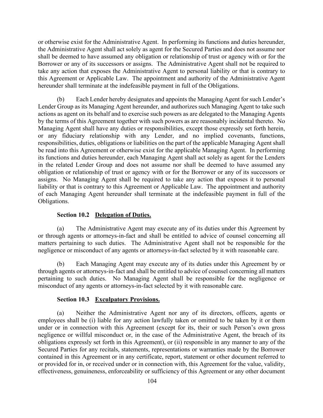 104或以其他方式存在为行政代理。行政代理人履行其在本协议项下的职能和职责,应仅作为有担保当事人的代理人,不承担也不应被视为与借款人或其任何继承人或受让人承担或为其承担任何信托或代理义务或关系。不得要求行政代理人采取任何使行政代理人承担个人责任或违反本协议或适用法律的行为。本协议项下行政代理人的委任和授权,应于不可撤销的全额支付义务时终止。(b)每一贷款人特此指定并委任该贷款人的贷款人集团的管理代理人为其根据本协议的管理代理人,并授权该管理代理人以代理人身份代表其采取行动,并行使本协议条款授予管理代理人的权力以及合理附带的权力。除本协议明文规定的义务或责任外,任何管理代理人不得有任何义务或责任,或与任何贷款人的任何信托关系,适用的管理代理人方面的默示契约、职能、责任、义务、义务或责任不得解读为本协议或适用的管理代理人以其他方式存在。各经管代理人在履行本协议规定的职能和职责时,应仅作为相关贷款人集团内贷款人的代理人,不承担也不应被视为与借款人或其任何继承人或受让人承担或为其承担任何信托或代理义务或关系。不得要求管理代理人采取任何使其承担个人责任或违反本协议或适用法律的行为。本协议项下各经理人的委任和授权应于不可撤销的全额支付义务时终止。第10.2节职责下放。(a)行政代理人可由或透过代理人或事实上的律师执行其在本协议下的任何职责,并有权就与该职责有关的所有事项获得大律师的意见。行政代理人对其合理谨慎选择的任何代理人或事实上的律师的失职或不当行为不负责任。(b)每一管理代理人可由或通过代理人或事实上的律师执行其在本协议下的任何职责,并有权就与此种职责有关的所有事项获得大律师的咨询意见。任何管理代理人不得对其合理谨慎选择的任何代理人或事实上的律师的疏忽或不当行为负责。第10.3节免责条款。(a)行政代理人或其任何董事、高级人员、代理人或雇员均不得(i)对其根据本协议或与本协议有关而合法采取或不采取的任何行动(其、其或该人本身的重大过失或故意不当行为除外,或就行政代理人而言,违反其在本协议中明确规定的义务)承担责任,或(ii)对任何有担保当事人以任何方式对任何陈述、陈述负责,本协议或本协议中提及或规定的、或根据本协议收到的或与本协议有关的任何证书、报告、声明或其他文件中所载的借款人就本协议或任何其他文件的价值、有效性、有效性、真实性、可执行性或充分性作出的陈述或保证