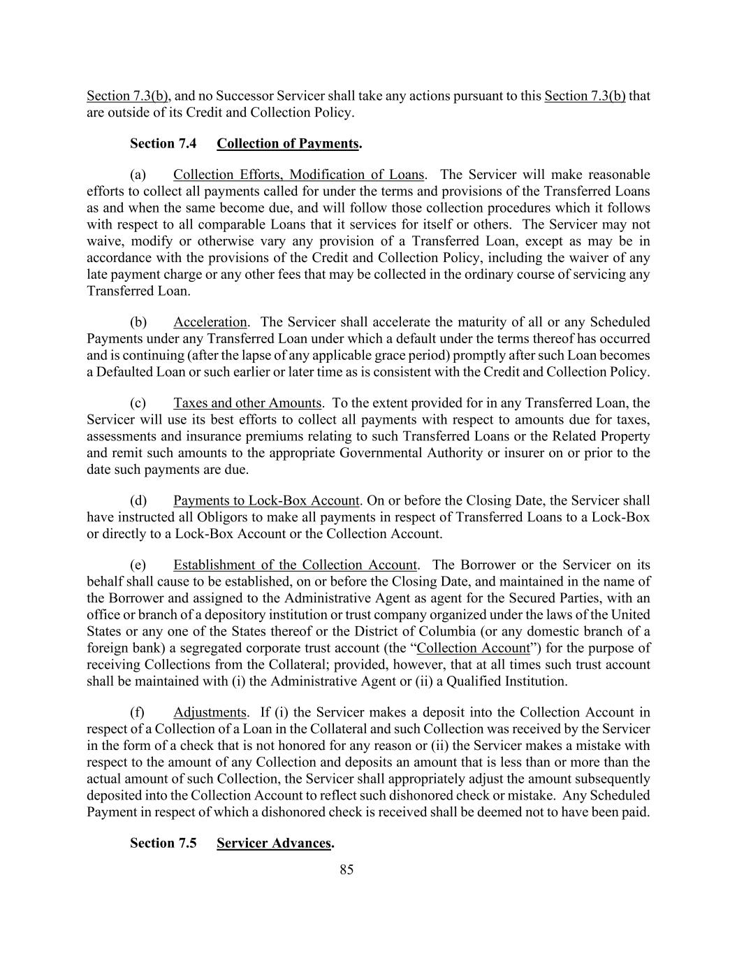 85第7.3(b)条,而任何继承服务人不得依据本条第7.3(b)条采取其信贷和收款政策之外的任何行动。第7.4节收款。(a)催收努力,修改贷款。服务商将作出合理努力,在转让贷款的条款和规定到期时收取所要求的所有款项,并将就其为自己或他人服务的所有可比贷款遵循其遵循的收款程序。服务人不得放弃、修改或以其他方式更改已转让贷款的任何规定,除非根据信贷和催收政策的规定,包括免除任何滞纳金或在为任何已转让贷款提供服务的正常过程中可能收取的任何其他费用。(b)加速。服务商应在任何已转让贷款项下的所有或任何预定付款在其条款下已发生违约并正在继续(在任何适用的宽限期失效后)在该贷款成为违约贷款或与信贷和催收政策一致的更早或更晚时间后迅速加速到期。(c)税款和其他数额。在任何转让贷款中规定的范围内,服务商将尽最大努力收取与此类转让贷款或相关财产有关的税款、评估和保险费到期金额的所有款项,并在此类款项到期之日或之前将此类款项汇给适当的政府当局或保险人。(d)对Lock-Box账户的付款。在截止日或之前,服务人应已指示所有义务人将有关已转让贷款的所有款项支付至锁箱或直接支付至锁箱账户或收款账户。(e)建立收款账户。借款人或代其服务人应安排在截止日期或之前以借款人的名义设立并维持并作为有担保当事人的代理人分配给行政代理人,与根据美国或其任何一国法律组建的存款机构或信托公司的办事处或分支机构或哥伦比亚特区(或外国银行的任何国内分支机构)建立独立的公司信托账户(“收款账户”),以接收抵押品的收款;但前提是,在任何时候,该信托账户应与(i)行政代理人或(ii)合格机构保持一致。(f)调整。(i)如(i)服务人就抵押品中的某项贷款的收款向收款帐户存入款项,而该等收款是由服务人以支票形式收取,但因任何理由而未予兑现,或(ii)服务人就任何收款的金额作出错误,并存入少于或多于该等收款的实际金额,则服务人须适当调整其后存入收款帐户的金额,以反映该等未兑现的支票或错误。收到拒付支票的任何预定付款应被视为未支付。第7.5节服务商垫款。