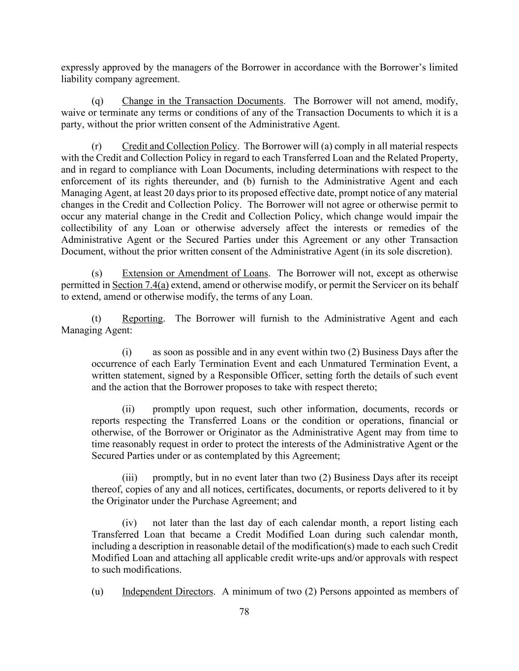经借款人管理人按照借款人有限责任公司协议明确认可的78。(q)交易文件的变更。未经行政代理人事先书面同意,借款人不会修改、修改、放弃或终止其作为当事人的任何交易文件的任何条款或条件。(r)信贷和催收政策。借款人将(a)在所有重大方面遵守关于每笔转让贷款和相关财产的信贷和催收政策,并在遵守贷款文件方面,包括关于强制执行其在该文件下的权利的决定,以及(b)至少在其提议的生效日期前20天向行政代理人和每个管理代理人提供信贷和催收政策的任何重大变化的及时通知。未经行政代理人事先书面同意(全权酌情决定),借款人不会同意或以其他方式允许发生信贷和催收政策的任何重大变更,该变更将损害任何贷款的可收回性或以其他方式对行政代理人或有担保当事人在本协议或任何其他交易文件下的利益或补救措施产生不利影响。(s)延长或修订贷款。除第7.4(a)条另有许可外,借款人将不会延长、修订或以其他方式修改任何贷款的条款,或允许服务人代表其延长、修订或以其他方式修改任何贷款的条款。(t)报告。借款人将向行政代理人和每一管理代理人提供:(i)在每一提前终止事件和每一未到期终止事件发生后的两(2)个工作日内,尽快并无论如何提供一份书面声明,由一名负责官员签署,其中载明该事件的详细情况以及借款人拟就此采取的行动;(ii)应要求迅速提供有关所转让贷款或财务或其他方面的条件或操作的其他信息、文件、记录或报告,作为行政代理人的借款人或发起人,为保护行政代理人或本协议项下或本协议所设想的有担保方的利益,可不时提出合理要求;(iii)迅速但在任何情况下不得迟于其收到后两(2)个营业日内,提供发起人根据采购协议向其交付的任何及所有通知、证书、文件或报告的副本;及(iv)不迟于每个日历月的最后一天,一份报告,列出在该日历月期间成为信用修改贷款的每笔转让贷款,包括对每笔此种信用修改贷款所作修改的合理详细说明,并附上与此种修改有关的所有适用的信用减记和/或批准。(u)独立董事。最少两(2)名获委任为