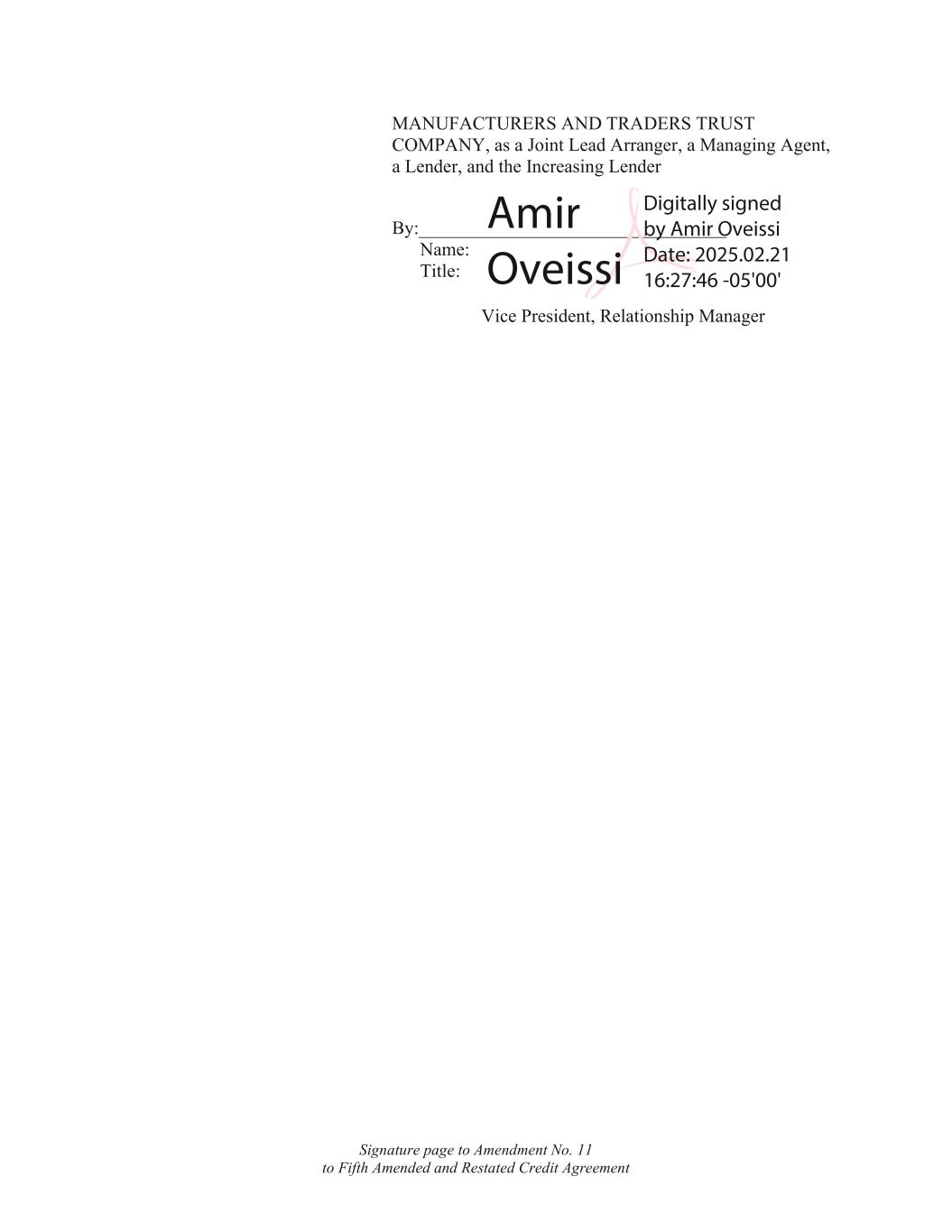 第11号至第5号修正案签署页经修订和重述的信贷协议制造商和贸易商信托公司,作为联席牵头安排人、管理代理人、贷款人和增加贷款人:__________________________________姓名:标题:Amir Oveissi数字签名Amir Oveissi日期:2025.0 2.2116:27:46-05‘00’