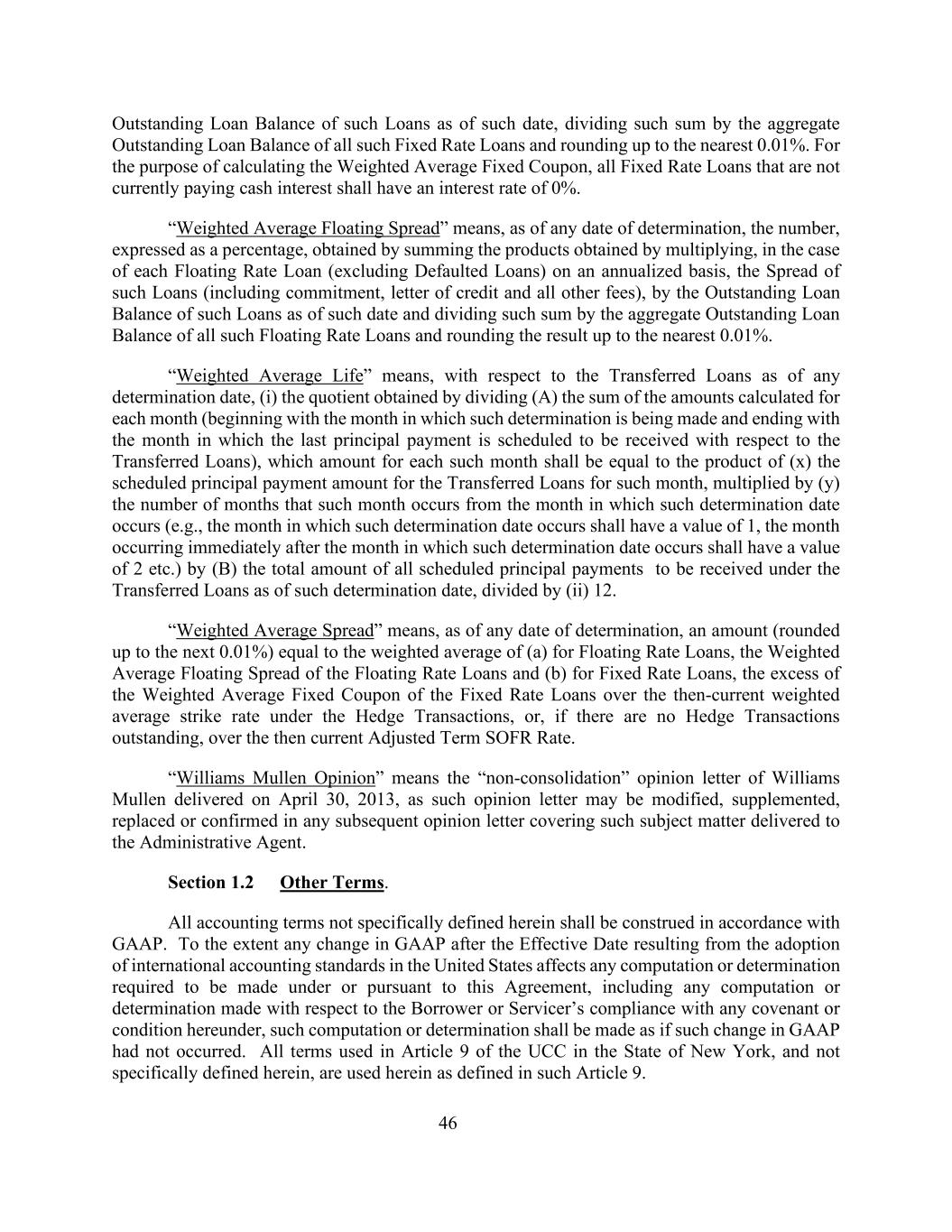 46截至该日期该等贷款的未偿还贷款余额,该金额除以所有该等固定利率贷款的未偿还贷款余额总额并四舍五入至最接近的0.01%。为计算加权平均固定息票,目前不支付现金利息的所有固定利率贷款的利率为0%。“加权平均浮动利差”是指,截至任何确定日期,以百分比表示的数字,在每笔浮动利率贷款(不包括违约贷款)按年计算的情况下,通过乘以所得乘积所得的乘积,该等贷款的利差(包括承诺、信用证和所有其他费用),除以截至该日期该等贷款的未偿还贷款余额,并将该金额除以所有该等浮动利率贷款的未偿还贷款余额总额,并将结果四舍五入至最接近的0.01%。“加权平均年限”是指,就截至任何确定日期的已转让贷款而言,(i)通过将(a)每月计算的金额之和(从作出该确定的月份开始,直至就已转让贷款预定收到最后一笔本金的月份结束)除以而获得的商,每个该等月份的金额应等于(x)该月份已转让贷款的预定本金支付金额的乘积,乘以(y)该月份自该确定日期发生的月份起发生的月份数(例如,该确定日期发生的月份的值应为1,紧接该确定日期发生的月份之后发生的月份的值应为2等)乘以(b)截至该确定日期根据转让贷款将收到的所有预定本金付款总额除以(ii)12。“加权平均利差”是指,截至任何确定日期,一笔金额(四舍五入到下一个0.01%)等于(a)浮动利率贷款的加权平均数、浮动利率贷款的加权平均浮动利差和(b)固定利率贷款的加权平均数,固定利率贷款的加权平均固定息票超过对冲交易项下当时的加权平均执行利率的部分,或者,如果没有未完成的对冲交易,超过当时调整的期限SOFR利率。“威廉姆斯 Mullen意见”是指2013年4月30日交付的TERMA Mullen的“非合并”意见函,因此该意见函可能会在随后交付给行政代理人的任何涵盖该标的的意见函中进行修改、补充、替换或确认。第1.2节其他条款。此处未具体定义的所有会计术语应按照GAAP进行解释。如果由于美国采用国际会计准则而在生效日期之后导致的GAAP的任何变化影响到根据本协议或根据本协议需要进行的任何计算或确定,包括就借款人或服务商遵守本协议下的任何契约或条件所进行的任何计算或确定,则应按照未发生GAAP的此类变化的方式进行此类计算或确定。纽约州的UCC第9条中使用的所有术语,且在此未作具体定义的,均按此类第9条中的定义在此使用。
