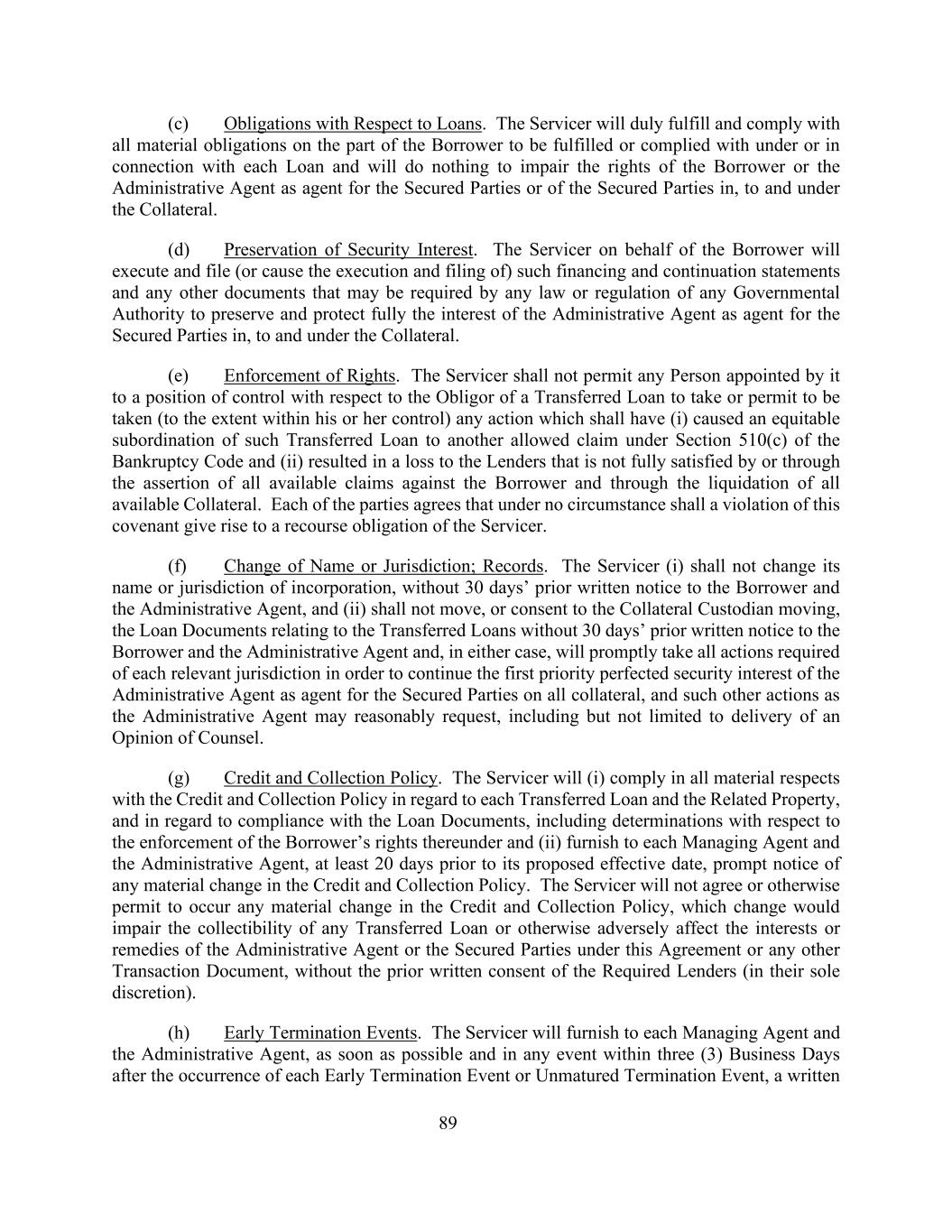 89(c)与贷款有关的义务。服务人将适当履行和遵守借款人根据每笔贷款或与每笔贷款有关而须履行或遵守的所有重大义务,并且不会损害借款人或作为有担保当事人或有担保当事人的代理人的行政代理人在担保物上、对担保物上和对担保物下的权利。(d)担保权益的保全。代表借款人的服务人将执行和归档(或促使执行和归档)此类融资和延续报表以及任何政府当局的任何法律或条例可能要求的任何其他文件,以维护和充分保护作为担保方代理人的行政代理人在担保物上、到担保物上和在担保物下的利益。(e)强制执行权利。服务商不得允许其指定的对转让贷款的债务人具有控制地位的任何人(在其控制范围内)采取或允许采取任何行动,而该行动应已(i)导致该转让贷款的衡平法从属地位于《破产法》第510(c)条规定的另一项允许的债权,以及(ii)导致贷款人的损失,但该损失未通过或通过对借款人的所有可用债权的主张以及通过清算所有可用抵押品而完全得到满足。各方同意,在任何情况下,违反本盟约的行为均不得引起服务人的追索义务。(f)更改名称或管辖权;记录。服务人(i)不得在未提前30天向借款人和行政代理人发出书面通知的情况下变更其名称或注册地管辖范围,以及(ii)不得在未提前30天向借款人和行政代理人发出书面通知的情况下移动或同意抵押品托管人移动与所转让贷款有关的贷款文件,并且在任何一种情况下,将迅速采取每个相关管辖范围所要求的所有行动,以延续行政代理人作为担保方代理人在所有担保物上的第一优先权完善的担保权益,以及行政代理人可能合理要求的其他行为,包括但不限于送达律师意见。(g)信贷和催收政策。服务商将(i)在所有重大方面遵守关于每笔转让贷款和相关财产的信贷和催收政策,并在遵守贷款文件方面,包括关于强制执行借款人在其下的权利的决定,以及(ii)至少在其提议的生效日期前20天向每一管理代理人和行政代理人提供信贷和催收政策的任何重大变化的及时通知。服务商将不会同意或以其他方式允许发生信贷和催收政策的任何重大变更,该变更将损害任何已转让贷款的可收回性或以其他方式对行政代理人或有担保当事人在本协议或任何其他交易文件下的利益或补救措施产生不利影响,而无需获得所需贷款人的事先书面同意(由其自行决定)。(h)提前终止事件。服务商将在每一提前终止事件或未成熟终止事件发生后的三(3)个工作日内,尽快并在任何情况下向每一管理代理和行政代理提供书面