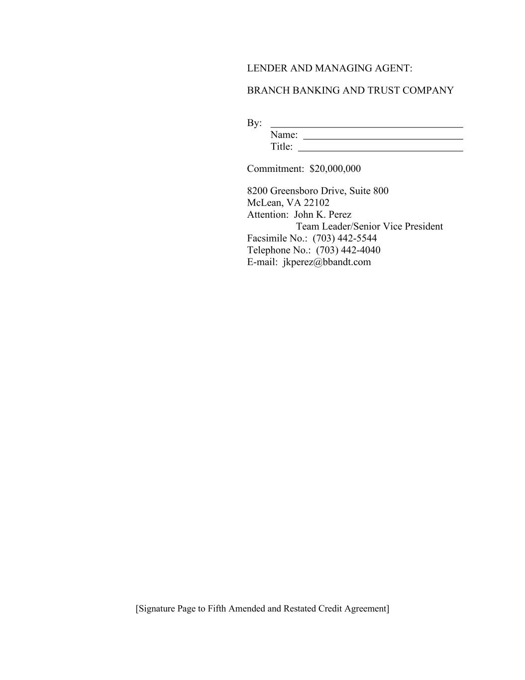 【签署页至第五次修订和重述的信贷协议】贷款人和管理代理人:分支银行和信托公司作者:姓名:标题:承诺:20,000,000美元8200 Greensboro Drive,Suite 800 McLean,VA 22102收件人:John K. Perez团队负责人/高级副总裁传真号码:(703)442-5544电话号码:(703)442-4040邮箱:jkperez@bbandt.com