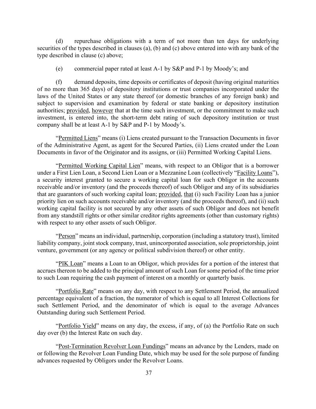37(d)与上述(a)、(b)和(c)条所述类型的任何银行就上述(a)、(b)和(c)条所述类型的基础证券订立的期限不超过十天的回购义务;(e)至少被标普评为A-1和被穆迪评为P-1的商业票据;(f)活期存款,根据美国或其任何州的法律注册成立的存款机构或信托公司(或任何外国银行的国内分支机构)的定期存款或存单(原始期限不超过365天),并接受联邦或州银行或存款机构当局的监督和审查;但前提是在订立该等投资或作出该等投资的承诺时,该存款机构或信托公司的短期债务评级应至少为标普的A-1和穆迪的P-1。“许可留置权”是指(i)根据交易文件为行政代理人(作为担保当事人的代理人)设定的留置权,(ii)根据贷款文件为发起人及其受让人设定的留置权,或(iii)许可的营运资金留置权。“许可营运资金留置权”是指,就作为第一留置权贷款、第二留置权贷款或夹层贷款(统称“融资贷款”)下的借款人的债务人而言,为在该债务人及其作为该营运资金贷款担保人的任何子公司的应收账款和/或存货(及其收益)中为该债务人的营运资金贷款提供担保而授予的担保权益;但前提是(i)该融资贷款对该应收账款和/或存货(及其收益)具有次级优先留置权,(ii)该营运资金融资不以该债务人的任何其他资产作担保,且不受益于与该债务人的任何其他资产有关的任何停顿权利或其他类似债权协议(习惯权利除外)。“人”是指个人、合伙企业、公司(包括法定信托)、有限责任公司、股份有限公司、信托、非法人协会、个人独资企业、合资企业、政府(或其任何机构或政治分支机构)或其他实体。“PIK贷款”是指向债务人提供的贷款,该贷款规定在该贷款需要按月或按季以现金支付利息之前的某段时间内,将由此产生的部分利息添加到该贷款的本金额中。“投资组合利率”是指在任何一天,就任何结算期而言,一个分数的年化等值百分比,其分子等于该结算期的所有利息收款,其分母等于该结算期的平均未偿还预付款。“投资组合收益率”是指在任何一天,(a)该日的投资组合利率超过(b)该日利率的部分(如有)。“终止后循环贷款融资”是指贷款人在循环贷款融资日期或之后作出的垫款,可用于为债务人根据循环贷款要求的垫款提供资金的唯一目的。