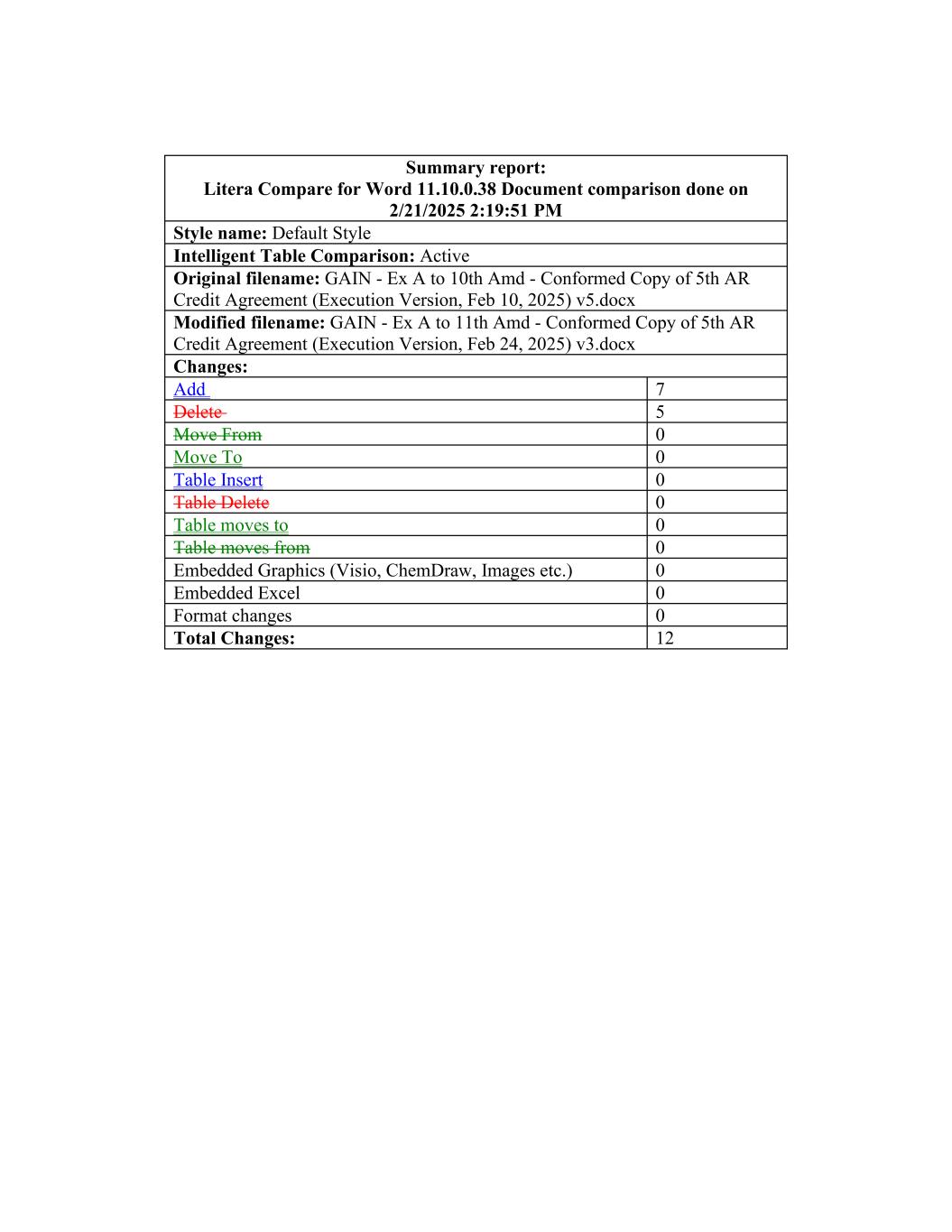 摘要报告:Litera Compare for Word 11.10.0.38 document comparison done on 2/21/20252:19:51 PM样式名称:默认样式智能表格比较:活动原始文件名:GAIN-EX A to 10th AMD-符合第5次AR信用协议副本(执行版,2025年2月10日)v5.docx修改文件名:GAIN-EX A to 11th AMD-符合第5次AR信用协议副本(执行版,2025年2月24日)v3.docx更改:添加7删除5从0移动到0表格插入0表格删除0表格移动到0嵌入图形(Visio,ChemDraw,图像等)0嵌入Excel 0格式更改0总更改:12