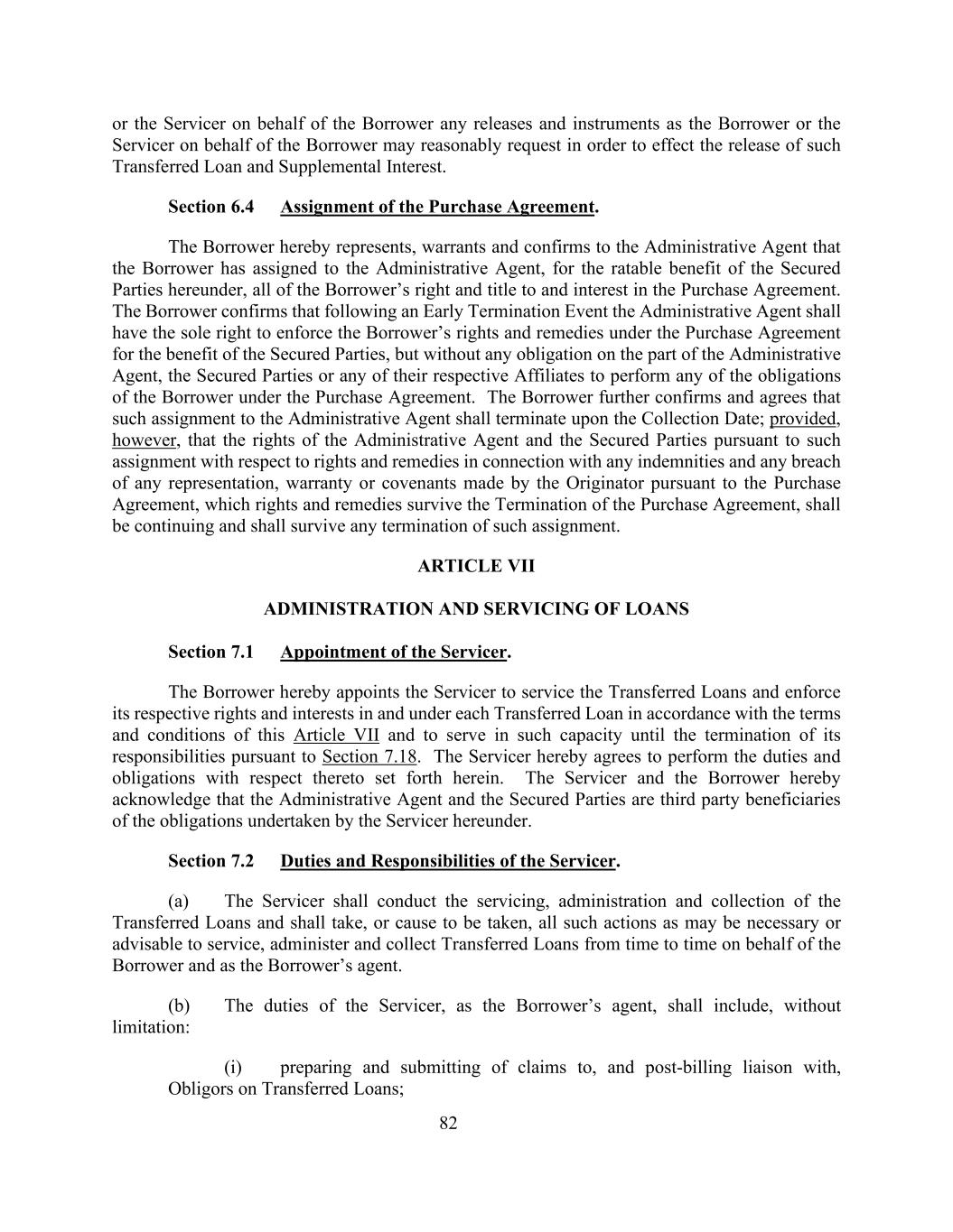 82或代表借款人的服务人作为借款人或代表借款人的服务人的任何解除和票据可合理要求,以实现此类转让贷款和补充利息的解除。第6.4节购买协议的转让。借款人在此向行政代理人陈述、保证和确认,借款人为了本协议项下有担保方的可评定利益,已将借款人在购买协议中的所有权利、所有权和权益转让给行政代理人。借款人确认,在发生提前终止事件后,行政代理人应拥有为有担保当事人的利益强制执行借款人在购买协议项下的权利和补救措施的唯一权利,但行政代理人、有担保当事人或其各自的任何关联人没有任何义务履行借款人在购买协议项下的任何义务。借款人进一步确认并同意,向行政代理人的此类转让应于收款日期终止;但条件是,行政代理人和有担保当事人根据此类转让就与任何赔偿和任何违反发起人根据购买协议作出的任何陈述、保证或契诺有关的权利和补救办法(这些权利和补救办法在购买协议终止后仍然有效)的权利和补救办法应继续存在,并应在此类转让的任何终止后仍然有效。第七条贷款的管理和服务第7.1节服务人的任命。借款人特此指定服务人为转让贷款提供服务,并根据本条第七条的条款和条件强制执行其在每笔转让贷款中和在每笔转让贷款下各自的权利和利益,并以该身份服务,直至根据第7.18条终止其责任。服务商在此同意履行与此相关的职责和义务。服务商和借款人在此确认,行政代理人和担保方是服务商在本协议项下所承担义务的第三方受益人。第7.2节服务者的义务和责任。(a)服务人须进行已转让贷款的服务、管理及收取,并须采取或安排采取一切必要或可取的行动,以不时代表借款人及作为借款人的代理人送达、管理及收取已转让贷款。(b)服务人作为借款人的代理人,其职责应包括但不限于:(i)就转让的贷款向债务人准备和提交债权,并与之进行帐单后联络;