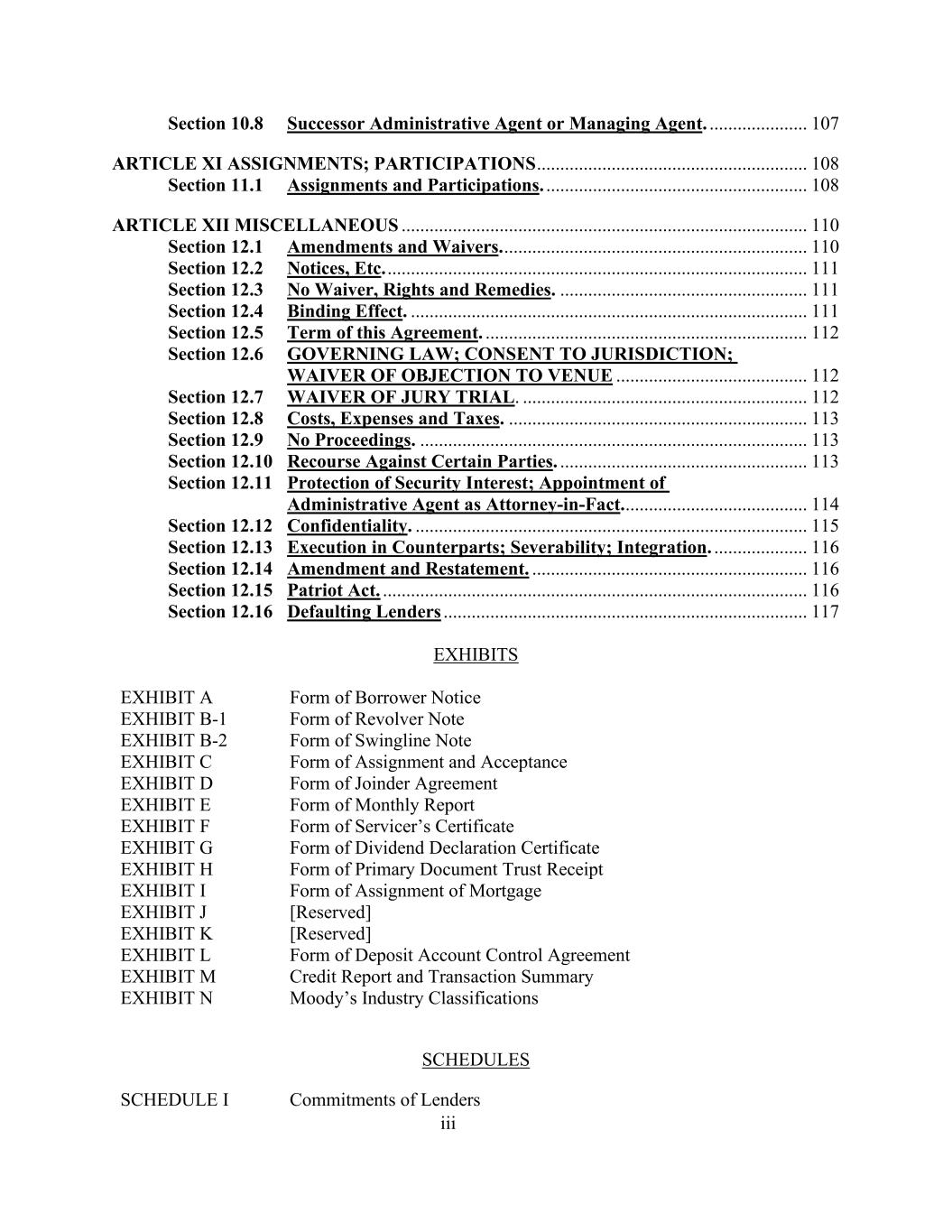 三、第10.8节继任行政代理人或管理代理人。..................... 107条XI任务;参加情况.................................................................... 108第11.1节任务和参加情况。........................................................ 108条第十二款杂项.................................................................................... 110第12.1节修正和豁免。.................................................................1 10第12.2节通知等......................................................................................1 11第12.3节没有放弃、权利和补救措施。.....................................................11 1第12.4节约束效力。...................................................................................1 11本协议第12.5节条款。....................................................112第12.6节管辖法律;同意管辖;放弃反对地点....................................................112第12.7节放弃陪审团审判。..................................................................1 12第12.8节成本、费用和税费。................................................................11 3第12.9节无诉讼程序。...................................................................................11 3第12.10节对某些当事人的追诉。.....................................................11 3第12.11节担保权益保护;指定行政代理人为实际代理人。.......................................11 4第12.12节保密。....................................................................................1 15节第12.13节对应方执行;可分割性;一体化。......................1 16第12.14条修正和重述。.................................................................... 116第12.15节《爱国者法案》。......................................................................................1 16第12.16节违约贷款人......................................................................................1 17展品展示表A借款人通知表展品B-1展品B-2表Swingline票据的循环票据表展品C表转让和接受表展品D表共同协议展品e表月度报告展品F表服务商凭证展品G表分红申报凭证展品H表主件信托收据展品I表抵押物转让表展品J [保留]展品K [保留]展品L表存款账户控制协议展品M信用报告和交易摘要附件N穆迪行业分类附表I贷款人的承诺