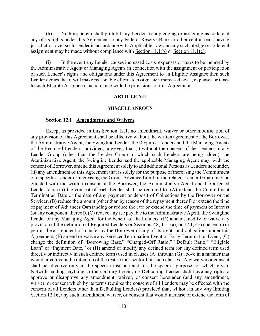 110(h)本文中的任何规定均不得禁止任何贷款人将其在本协议下的任何权利作为抵押品质押或转让给根据适用法律对该贷款人具有管辖权的任何联邦储备银行或其他中央银行,并且任何此类质押或抵押品转让均可在不遵守第11.1(b)节或第11.1(c)节的情况下进行。(i)如任何贷款人导致行政代理人或管理代理人因将该贷款人在本协议下的权利和义务转让或参与转让给合格受让人而招致增加的成本、费用或税款,则该贷款人同意,其将作出合理努力,按照本协议的规定将此种增加的成本、费用或税款转让给该合格受让人。第十二条杂项第12.1节的修正和放弃。除本条第12.1款另有规定外,未经借款人、行政代理人、Swingline贷款人、规定贷款人及规定贷款人的管理代理人的书面同意,对本协议任何条款的任何修改、放弃或其他修改均不具有效力;但(i)未经任何贷款人集团中的贷款人同意(该等贷款人正被加入的贷款人集团除外),行政代理人、Swingline贷款人及适用的管理代理人可经借款人同意,修改本协议仅是为了增加额外的人作为本协议项下的贷款人,(ii)本协议的任何修改,如果仅仅是为了增加特定贷款人的承诺或增加相关贷款人集团的集团预付款限额,则可在借款人、行政代理人和受影响的贷款人书面同意的情况下进行,并且(iii)应要求每个贷款人的同意:(a)延长承诺终止日期或借款人或服务人支付或存入任何收款的日期,(b)减少未偿还垫款的款额(因偿还而除外)或延长垫款的支付时间或降低利率或延长利息(或其任何组成部分)的支付时间,(c)为贷款人的利益减少应付给行政代理人、Swingline贷款人或任何管理代理人的任何费用,(d)修订、修改或放弃规定贷款人定义的任何条文或第2.8、11.1(a)或12.1条,(e)同意或允许借款人转让或转让其在本协议下的任何权利和义务,(f)修改或放弃任何服务商终止事件或提前终止事件,(g)更改“借款基数”、“冲销比率”、“违约比率”、“合格贷款”或“付款日期”的定义,或(h)修改或修改上述(a)至(g)条中使用的任何定义术语(或在该定义术语中直接或间接使用的任何定义术语),其方式将规避该等条款所载限制的意图。任何放弃或同意仅在特定情况下并为所给予的特定目的有效。尽管有任何与此相反的规定,任何违约贷款人均无权批准或不批准根据本协议作出的任何修订、放弃或同意(以及根据其条款需要所有贷款人同意的任何修订、放弃或同意,可在征得除违约贷款人以外的所有贷款人同意的情况下进行),但在不以任何方式限制第12.16条的情况下,任何此类修订、放弃或同意将增加或延长
