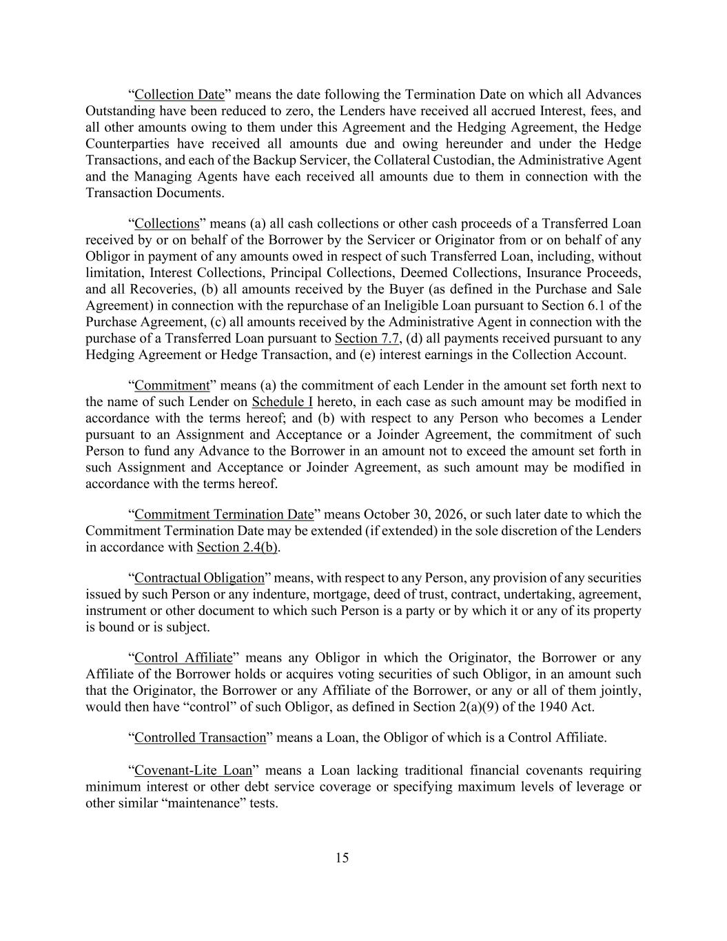 15“收款日”是指终止日期的次日,所有未偿还的垫款已减至零,贷款人已收到所有应计利息、费用以及根据本协议和套期保值协议欠他们的所有其他款项,对冲对手方已收到本协议项下和对冲交易项下的所有到期和欠款,备用服务商、抵押托管人、行政代理人和管理代理人各自已收到与交易文件有关的所有应付给他们的款项。“收款”是指(a)由服务人或发起人从或代表任何债务人收到的转让贷款的所有现金收款或其他现金收益,用于支付与该转让贷款有关的任何欠款,包括但不限于利息收款、本金收款、视同收款、保险收益和所有追偿,(b)买方收到的与根据购买协议第6.1节回购不合格贷款有关的所有款项(定义见买卖协议),(c)行政代理人根据第7.7条就购买转让贷款而收到的所有款项,(d)根据任何对冲协议或对冲交易收到的所有付款,以及(e)收款账户中的利息收益。“承诺”是指(a)每个贷款人对本协议附表I该贷款人名称旁边所列金额的承诺,在每种情况下,该金额可能会根据本协议的条款进行修改;(b)就根据转让和接受或共同协议成为贷款人的任何人而言,该人承诺为向借款人提供的任何预付款提供资金,金额不超过该转让和接受或共同协议中规定的金额,因为这样的金额可能会根据本协议的条款进行修改。“承诺终止日期”是指2026年10月30日,或贷款人可根据第2.4(b)节全权酌情决定将承诺终止日期延长(如延长)的较后日期。“合同义务”就任何人而言是指该人发行的任何证券的任何条款或该人作为一方当事人或其或其任何财产受其约束或受其约束的任何契约、抵押、信托契据、合同、承诺、协议、文书或其他文件。“控制附属公司”是指发起人、借款人或借款人的任何附属公司持有或获得该债务人的有表决权证券的任何债务人,其数额使发起人、借款人或借款人的任何附属公司,或其中任何一方或所有人共同拥有对该债务人的“控制权”,如1940年法案第2(a)(9)节所定义。“受控交易”是指贷款,其义务人是控制关联公司。“Covenant-Lite Loan”是指缺乏传统金融契约要求最低利息或其他偿债覆盖范围或指定最高杠杆水平或其他类似“维持”测试的贷款。