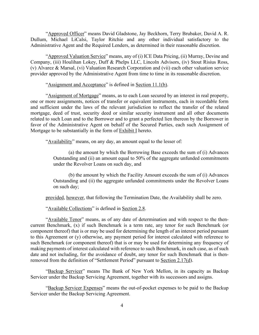4“获批准官员”是指由行政代理人和所需贷款人满意的任何其他个人,由他们合理酌情权确定,由David Gladstone、Jay Beckhorn、Terry L. Brubaker、TERM1、TERM1、David A. R. Dullum、Michael LiCalsi、Taylor Ritchie和任何其他个人组成。“经批准的估值服务”指(i)ICE数据定价,(ii)Murray、Devine and Company,(iii)华利安、达夫菲尔普斯 LLC、Lincoln Advisors,(iv)Stout Risius Ross,(v)Alvarez & Marsal,(vi)Valuation Research Corporation及(vii)互为行政代理人不时以合理酌情权批准的估值服务供应商。第11.1(b)节对“转让和接受”进行了定义。“转让抵押”是指,就以不动产权益为担保的每笔贷款、一项或多项转让、转让通知或同等文书,每一项均为可记录形式,且根据相关司法管辖区的法律足以反映相关抵押、信托契据、担保契据或类似担保文书以及与该贷款有关的所有其他文件的转让情况,并由借款人代表有担保方授予有利于行政代理人的完善的留置权,每一笔此类抵押转让基本上都采取本协议所述的附件形式。“可用性”是指,在任何一天,金额等于以下两者中的较小者:(a)借款基数超过(i)未偿预付款和(ii)相当于该日循环贷款项下无资金承诺总额50%的金额,以及(b)融资金额超过(i)未偿预付款和(ii)该日循环贷款项下无资金承诺总额之和的金额;但条件是,在终止日期之后,可用性应为零。第2.8节定义了“可用的收藏”。“可用期限”是指,截至任何确定日期,就当时的基准而言,(x)如果该基准为定期利率,则该基准(或其组成部分)的任何期限,即目前或可能用于根据本协议确定利息期长度,或(y)其他情况,参照该基准(或其组成部分)计算的利息的任何支付期限,在每种情况下,目前或可能用于确定参照该基准计算的利息支付的任何频率,截至该日期,且为免生疑问,不包括该基准的任何期限,而该期限随后根据第2.17(d)节从“结算期”的定义中删除。“备份服务商”指纽约梅隆银行,作为备份服务协议下的备份服务商,连同其继任者和受让人。“备份服务商费用”是指根据备份服务协议向备份服务商支付的自付费用。