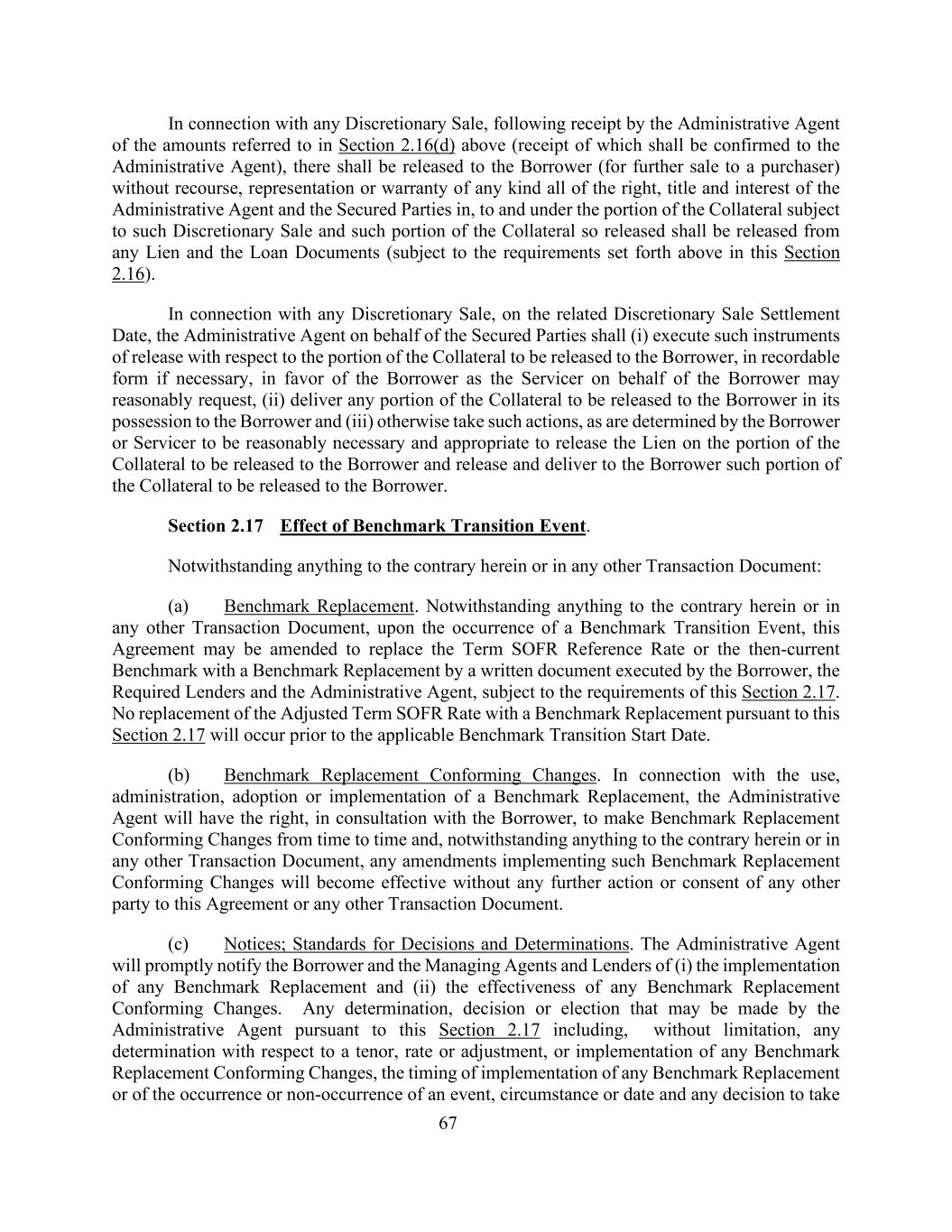 67就任何酌情出售而言,在行政代理人收到上述第2.16(d)节所指的金额(其收到应向行政代理人确认)后,应在没有任何追索权、代表或任何种类的保证的情况下向借款人解除行政代理人和有担保当事人的所有权利、所有权和利益,受该等酌情出售规限的抵押品的部分及根据该部分如此解除的抵押品,须解除任何留置权及贷款文件(但须符合本条第2.16条的上述规定)。就任何酌情出售而言,在相关的酌情出售结算日,代表有担保当事人的行政代理人应(i)就将向借款人解除的担保物部分签署必要时以可记录形式有利于借款人的解除文书,这是代表借款人的服务人可能合理要求的,(ii)将将将解除的担保物的任何部分交付其管有的借款人给借款人,以及(iii)以其他方式采取此类行动,由借款人或服务商确定为合理必要和适当的,以解除对将解除给借款人的抵押品部分的留置权,并解除和向借款人交付将解除给借款人的抵押品部分。第2.17节基准转换事件的效果。尽管本文或任何其他交易文件中有任何相反的规定:(a)基准替换。尽管本文或任何其他交易文件中有任何相反的规定,但在发生基准转换事件时,本协议可以修改,以由借款人、所需贷款人和行政代理人签署的书面文件以基准替换取代SOFR参考利率或当时的基准,但以符合本节2.17的要求为限。在适用的基准过渡开始日期之前,不会发生根据本节2.17以基准更替取代调整后的定期SOFR费率的情况。(b)基准更换符合变化。就基准替换的使用、管理、采用或实施而言,行政代理人将有权与借款人协商,不时进行基准替换符合性变更,并且,尽管本文或任何其他交易文件中有任何相反的规定,实施此类基准替换符合性变更的任何修订将生效,而无需本协议或任何其他交易文件的任何其他方采取任何进一步行动或同意。(c)通知;决定和裁定的标准。行政代理人将及时将(i)任何基准更换的实施情况和(ii)任何基准更换符合变更的有效性通知借款人和管理代理和贷款人。行政代理人根据本条第2.17款可能作出的任何决定、决定或选择,包括但不限于与期限、费率或调整有关的任何决定,或与任何基准更换符合变更的实施有关的任何确定,任何基准更换的实施时间,或某一事件、情况或日期的发生或不发生的时间,以及采取的任何决定