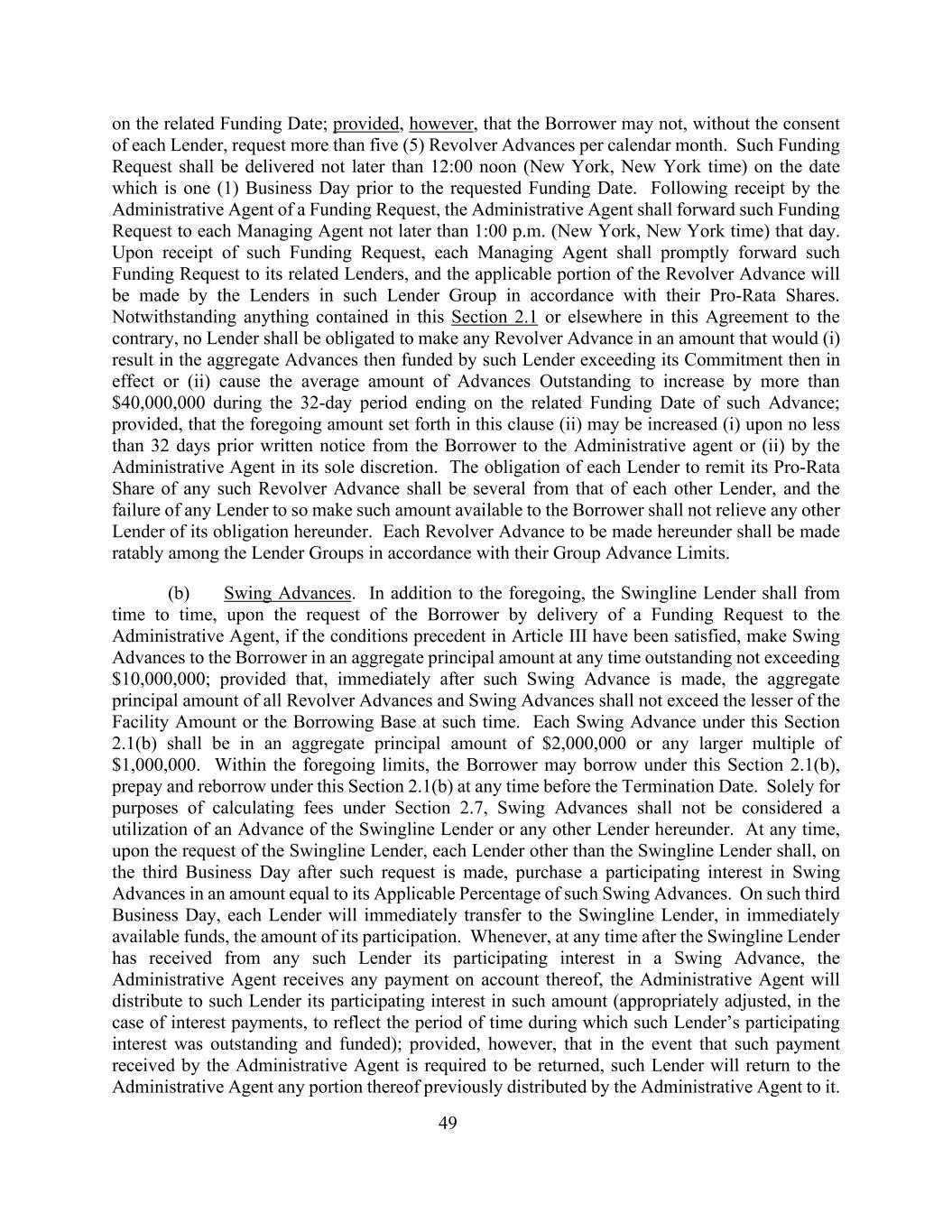 49在相关筹资日期;但条件是,未经每个贷款人同意,借款人不得要求每个日历月超过五(5)次循环预付款。此类资金请求应不迟于所请求的资金日期前一(1)个工作日当天中午12:00(纽约、纽约时间)送达。行政代理人收到资金请求后,行政代理人应不迟于当天下午1:00(纽约、纽约时间)将该资金请求转发给各管理代理人。在收到此种资金请求后,各管理代理应立即将此种资金请求转发给其相关贷款人,循环预付款的适用部分将由该贷款人集团中的贷款人按照其按比例分配的份额进行。尽管本条第2.1款或本协议其他条款中有任何相反的规定,任何贷款人均无义务提供任何循环预付款,其数额将(i)导致该贷款人当时提供资金的预付款总额超过其当时有效的承诺,或(ii)导致在截至该预付款的相关供资日的32天期间内,未付预付款的平均数额增加超过40,000,000美元;但前提是,本条款(ii)所列的前述金额可在借款人至少提前32天向行政代理人发出书面通知或(ii)由行政代理人全权酌情决定后增加(i)。每个贷款人汇出其在任何此类循环预付款中按比例分配的份额的义务应与其他贷款人的义务不同,任何贷款人未能向借款人提供此类金额不应解除任何其他贷款人在本协议项下的义务。根据本协议进行的每笔左轮式预付款应在贷款人集团之间按照其集团预付款限额按比例进行。(b)摇摆不定的进展。除上述规定外,如果第III条的先决条件已获满足,Swingline贷款人应借款人通过向行政代理人交付资金请求的方式不时向借款人提供周转垫款,其未偿还本金总额在任何时候不超过10,000,000美元;但在立即进行此种周转垫款后,所有循环垫款和周转垫款的本金总额不得超过当时的融资金额或借款基数中的较低者。根据本条第2.1(b)款,每笔周转预付款的本金总额应为2000000美元或1000000美元的任何较大倍数。在上述限额内,借款人可在终止日期前的任何时间根据本条第2.1(b)款借款、预付款项和根据本条第2.1(b)款再借款。仅为根据第2.7节计算费用的目的,周转预付款不应被视为利用Swingline贷款人或本协议项下任何其他贷款人的预付款。在任何时候,应Swingline贷款人的请求,除Swingline贷款人之外的每个贷款人应在提出该请求后的第三个工作日购买Swing Advances的参与权益,金额等于其在该Swing Advances中的适用百分比。在这样的第三个工作日,每个贷方将立即向Swingline贷方转移,在立即可用的资金中,其参与的金额。每当Swingline贷款人从任何该等贷款人收到其在一笔周转预付款中的参与权益后的任何时间,行政代理人因此而收到任何付款,该行政代理人将向该贷款人分配其在该金额中的参与权益(在利息支付的情况下,适当调整以反映该贷款人的参与权益未偿还和获得资金的期间);但是,如果要求退还该行政代理人收到的此类付款,此类贷款人将向行政代理人退还行政代理人先前分配给它的任何部分。