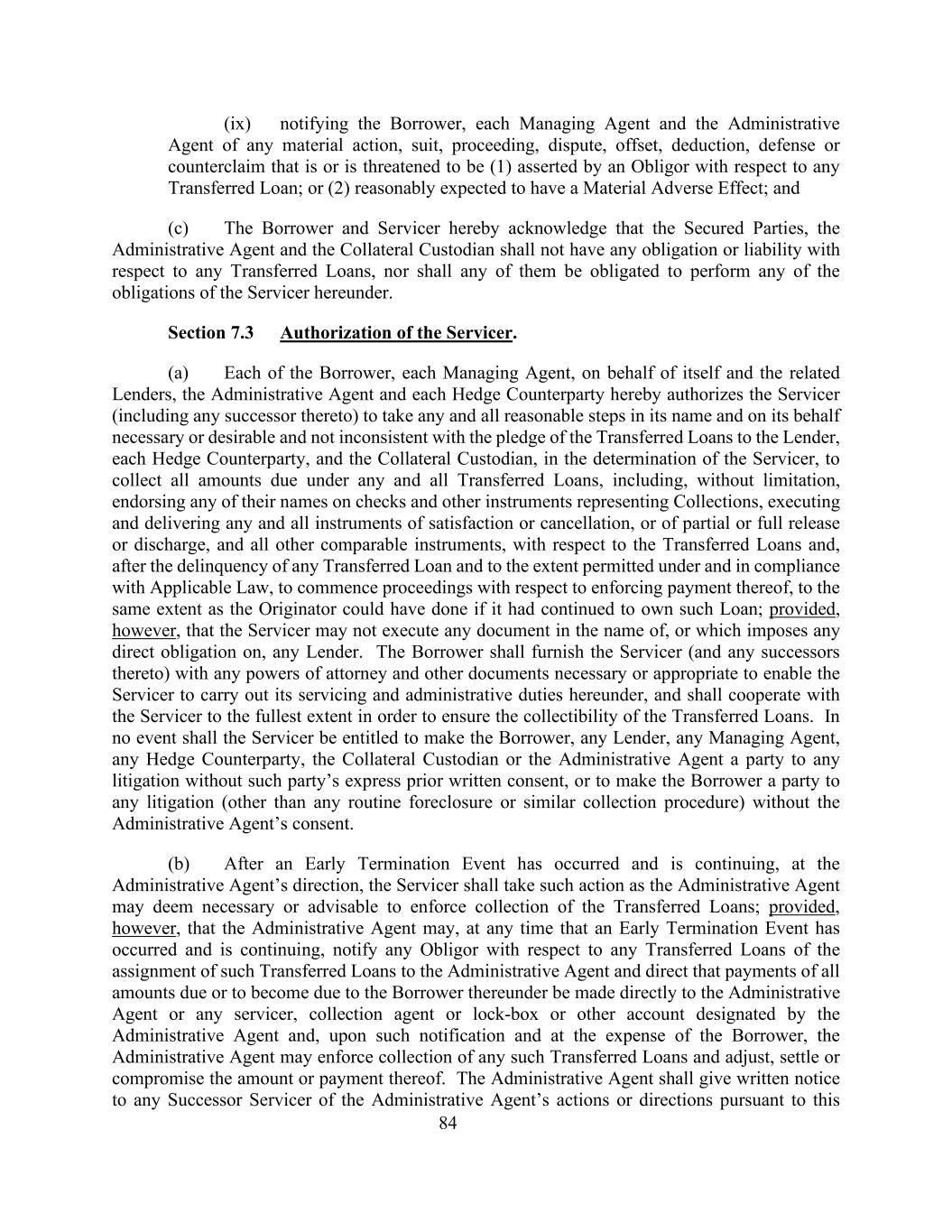 84(ix)通知借款人、每个管理代理人和行政代理人任何重大诉讼、诉讼、程序、争议、抵消、扣除、抗辩或反索赔(1)由债务人就任何转让的贷款主张;或(2)合理预期会产生重大不利影响;(c)借款人和服务人在此承认,有担保的当事人、行政代理人和抵押托管人对任何转让的贷款不承担任何义务或责任,他们中的任何一个也没有义务履行服务商在本协议项下的任何义务。第7.3节服务商的授权。(a)每一借款人、每一管理代理人、代表其本身和相关贷款人、行政代理人和每一对冲对手方特此授权服务商(包括其任何继任者)以其名义并代表其采取任何和所有合理步骤,必要或可取,且不与向贷款人、每一对冲对手方和抵押托管人的转让贷款质押相抵触,在确定服务商时,收取任何和所有转让贷款项下的所有到期款项,包括但不限于,在支票和其他代表催收的文书上背书他们的任何名字,执行和交付任何和所有的清偿或取消文书,或部分或全部解除或解除文书,以及与转让贷款有关的所有其他类似文书,并在任何转让贷款拖欠后并在适用法律允许和遵守的范围内,启动与强制支付有关的程序,其程度与如果发起人继续拥有此类贷款本可以做的程度相同;但是,前提是,服务商不得以任何贷款人的名义执行任何文件,或对任何贷款人施加任何直接义务。借款人应向服务人(及其任何继承人)提供任何必要或适当的授权书和其他文件,以使服务人能够履行其在本协议项下的服务和行政职责,并应与服务人进行最大程度的合作,以确保所转让贷款的可收回性。在任何情况下,服务人均无权使借款人、任何贷款人、任何管理代理人、任何对冲对手方、抵押品托管人或行政代理人成为任何诉讼的一方当事人,也无权使借款人成为任何诉讼的一方当事人(任何例行的止赎或类似的催收程序除外),而无需行政代理人的同意。(b)在提前终止事件已经发生并正在继续的情况下,在行政代理人的指示下,服务人应采取行政代理人认为必要或可取的行动,以强制收取已转让的贷款;但条件是,行政代理人可以在提前终止事件已经发生并正在继续的任何时候,将此种转让贷款转让给行政代理人的情况通知任何转让贷款的义务人,并指示直接向行政代理人或行政代理人指定的任何服务人、托收代理人或锁箱或其他账户支付根据该协议到期或将到期的所有金额,经此通知并由借款人承担费用,行政代理人可强制收取任何此种转让贷款,并调整、结算或妥协其金额或支付。行政代理人应当将行政代理人依据本规定的行为或者指示书面通知任何继任服务人