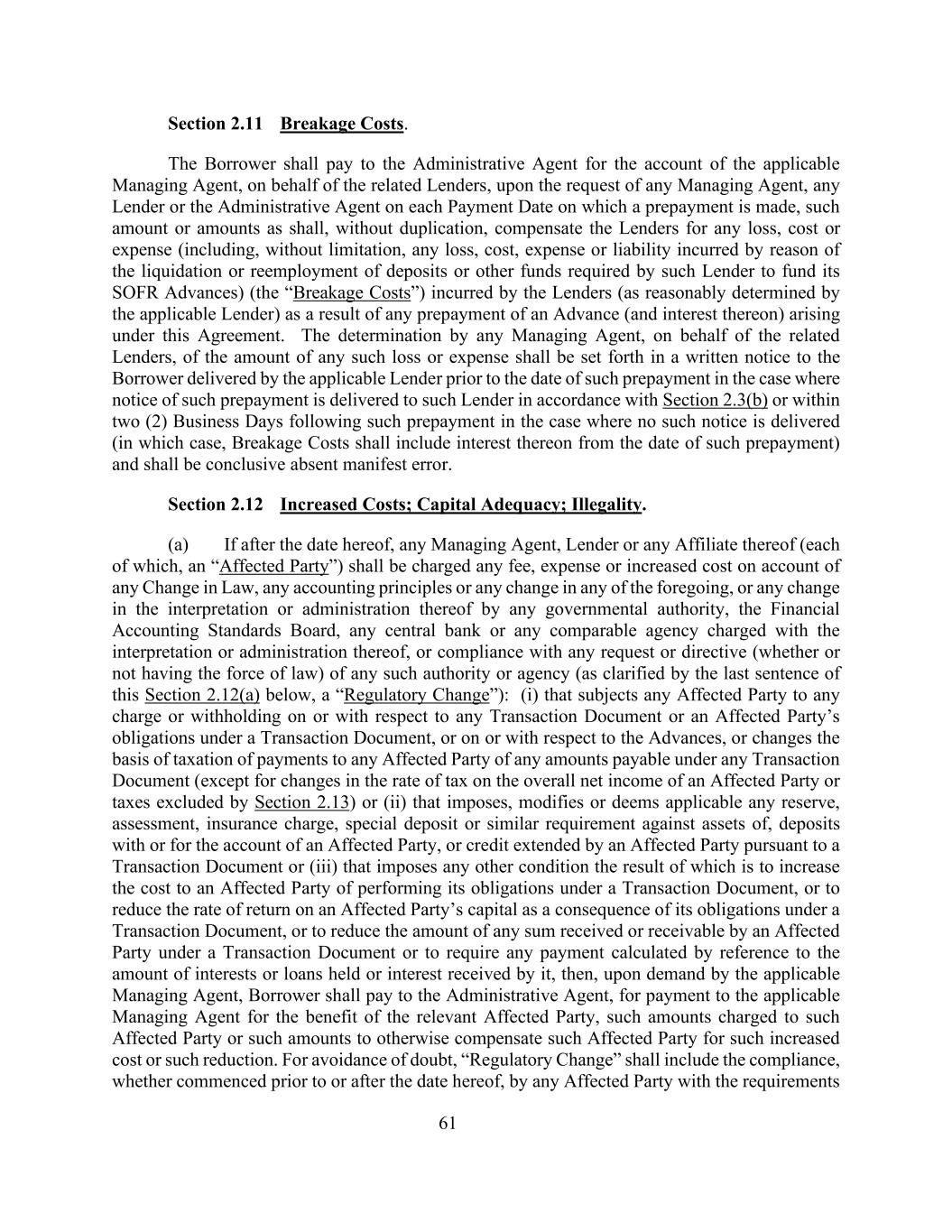 61第2.11款破碎费。借款人应在提前还款的每个付款日,应任何管理代理人、任何贷款人或行政代理人的请求,代表相关贷款人向适用的管理代理人账户的行政代理人支付一笔或多笔金额,不得重复,以补偿贷款人的任何损失、成本或费用(包括但不限于任何损失、成本、贷款人(由适用的贷款人合理确定)因根据本协议产生的任何预付款(及其利息)而产生的存款或该贷款人为其SOFR预付款所需的其他资金的清算或再雇用而产生的费用或负债(“破产成本”)。任何管理代理人代表相关贷款人确定任何该等损失或费用的金额,须在适用贷款人根据第2.3(b)条向该贷款人交付该等提前还款通知的情况下,或在该等提前还款通知未交付的情况下,在该提前还款通知后两(2)个营业日内(在该情况下,破碎费应包括自预付之日起的利息),且无明显错误为结论性的。第2.12节增加成本;资本充足;违法。(a)如在本协议日期后,任何管理代理人、贷款人或其任何关联机构(每一方均为“受影响方”)应因任何法律变更、任何会计原则或上述任何一项的变更,或任何政府当局、财务会计准则委员会、任何中央银行或负责解释或管理其解释或管理的任何类似机构对其解释或管理的任何变更而被收取任何费用、开支或增加的成本,或遵守任何此类当局或机构的任何请求或指示(无论是否具有法律效力)(如下文第2.12(a)节最后一句所澄清,“监管变更”):(i)使任何受影响方对任何交易文件或受影响方在交易文件下的义务或对垫款或对垫款承担任何费用或预扣,或更改根据任何交易文件向任何受影响方支付的任何应付款项的征税基础(受影响方整体净收益的税率变化或第2.13节排除的税款除外)或(ii)对受影响方的资产、存放于或为受影响方账户的存款征收、修改或认为适用任何准备金、评估、保险费、特别存款或类似要求,或受影响方根据交易文件或(iii)施加任何其他条件而提供的信贷,其结果是增加受影响方履行其在交易文件下的义务的成本,或因受影响方在交易文件下的义务而降低其资本回报率,或减少受影响方根据交易文件收到或应收的任何款项的金额或要求参照其持有的利息或贷款的金额或收到的利息计算的任何付款,则根据适用的管理代理人的要求,借款人应向行政代理人支付为相关受影响方的利益向适用的管理代理人支付的向该受影响方收取的该等金额或以其他方式补偿该受影响方的该等增加的成本或该等减少的金额。为免生疑问,“监管变更”应包括任何受影响方遵守要求,无论是在本协议日期之前还是之后开始