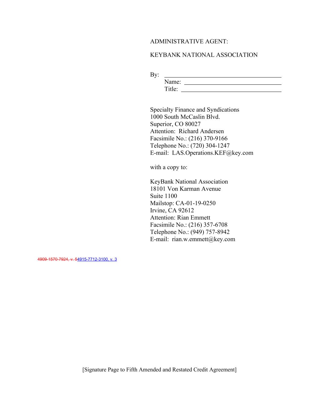 【签署页至第五次修订和重述的信贷协议】行政代理人:KEYBANK NATIONAL Association by:Name:Title:Specialty Finance and Syndications 1000 South McCaslin Blvd. Superior,CO 80027收件人:Richard Andersen传真号码:(216)370-9166电话号码:(720)304-1247邮箱:LAS.Operations.KEF@key.com并抄送:KEYBANK National Association 18101 von Karman Avenue Suite 1100 Mailstop:CA-01-19-0250 Irvine,加利福尼亚州 92612收件人:Rian Emmett传真号码:(216)357-6708电话号码:(949)757-8942邮箱:rian.com