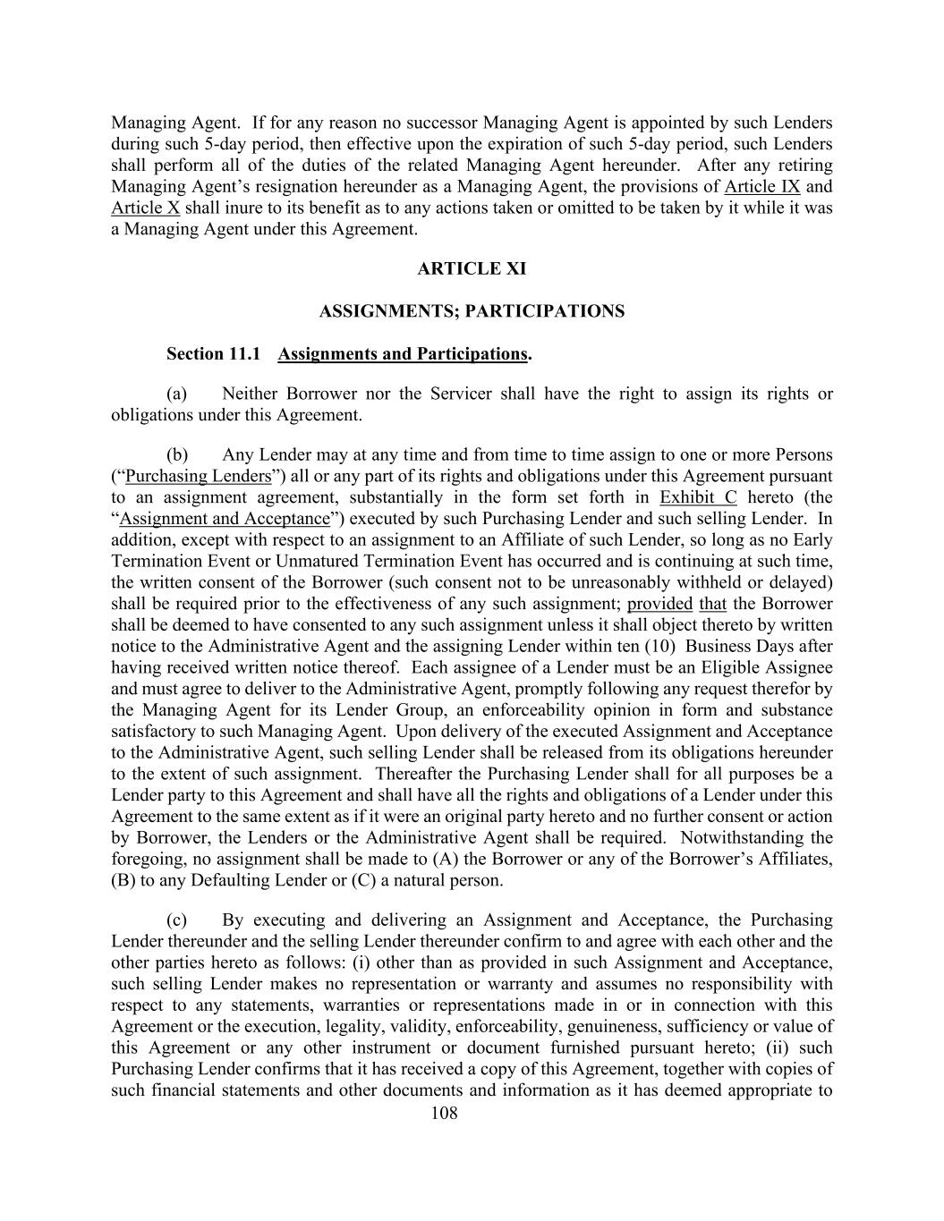 108管理代理。如因任何原因,该等贷款人在该5天期限内未指定继任管理代理人,则自该5天期限届满时生效,该等贷款人应履行本协议项下相关管理代理人的所有职责。任何退任管理代理人在本协议项下辞去管理代理人职务后,其在本协议项下担任管理代理人期间采取或不采取的任何行动,第九条和第十条的规定对其有利。第一条XI任务;参与第11.1节任务和参与。(a)借款人和服务人均无权转让其在本协议下的权利或义务。(b)任何贷款人可在任何时间及不时根据转让协议将其在本协议下的全部或任何部分权利及义务转让予一名或多于一名人士(“购买贷款人”),其形式大致为由该购买贷款人及该出售贷款人签立的本协议所载的附件 C(“转让及接受”)。此外,除向该贷款人的附属公司作出的转让外,只要没有发生提前终止事件或未成熟的终止事件,并在此时继续进行,在任何该等转让生效前,须取得借款人的书面同意(该等同意不得被无理拒绝或延迟);但借款人须当作已同意任何该等转让,除非其在收到书面通知后十(10)个营业日内以书面通知行政代理人及转让贷款人的方式反对。贷款人的每一受让人必须是合格的受让人,并且必须同意在管理代理人为其贷款人集团提出任何要求后立即向行政代理人交付一份形式和实质上令该管理代理人满意的可执行性意见。在将已执行的转让和接受交付给行政代理人时,该出售贷款人应在该转让的范围内解除其在本协议项下的义务。此后,采购贷款人就所有目的而言均应为本协议的贷款方,并应享有贷款人在本协议下的所有权利和义务,其程度与其为本协议的原始当事人相同,且无需借款人、贷款人或行政代理人的进一步同意或行动。尽管有上述规定,不得向(a)借款人或借款人的任何附属公司、(b)任何违约贷款人或(c)自然人作出转让。(c)通过执行和交付转让和接受,根据该转让和接受的购买贷款人和根据该转让和接受的出售贷款人相互确认并同意如下:(i)除该转让和接受规定外,该出售贷款人不对在本协议中作出或与本协议有关的任何陈述、保证或陈述或执行、合法性、有效性、可执行性、真实性承担任何责任,本协议或根据本协议提供的任何其他文书或文件的充分性或价值;(ii)该采购贷款人确认已收到本协议的副本,连同其认为适当的财务报表和其他文件及资料的副本,以