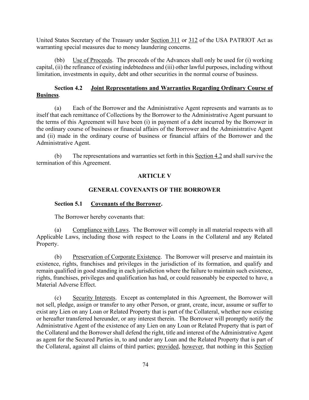 74美国财政部长根据《美国爱国者法案》第311或312条规定,由于洗钱问题,有必要采取特别措施。(BB)所得款项用途。垫款所得款项仅用于(i)营运资金、(ii)现有债务的再融资及(iii)其他合法用途,包括但不限于在正常业务过程中对股权、债务及其他证券的投资。第4.2节关于正常业务过程的共同陈述和保证。(a)每一借款人和行政代理人对自己表示并保证,借款人依据本协议条款向行政代理人的每笔收款汇款将(i)用于支付借款人在借款人和行政代理人的正常业务过程或财务事务中发生的债务,以及(ii)在借款人和行政代理人的正常业务过程或财务事务中发生的债务。(b)本条第4.2条所列的申述及保证,并在本协议终止后继续有效。第五条借款人的一般盟约第5.1节借款人的盟约。借款人在此承诺:(a)遵守法律。借款人将在所有重大方面遵守所有适用法律,包括与抵押品中的贷款和任何相关财产有关的法律。(b)维护公司存在。借款人将保留和维持其在其成立的司法管辖区内的存在、权利、专营权和特权,并在未能维持此类存在、权利、专营权、特权和资格已经产生或可以合理预期会产生重大不利影响的每个司法管辖区内具有良好信誉的资格和保持资格。(c)担保权益。除本协议所设想的情况外,借款人将不会出售、质押、转让或转让给任何其他人,或授予、创建、招致、承担或容忍对作为抵押品一部分的任何贷款或相关财产的任何留置权,无论是现在存在的还是以后根据本协议转让的,或其中的任何权益。借款人将作为担保物一部分的任何贷款或相关财产存在任何留置权的情况及时通知行政代理人,借款人应针对第三方的所有债权,捍卫作为担保方代理人的行政代理人在任何贷款中、在任何贷款中以及在任何担保物一部分的相关财产下的权利、所有权和利益;但前提是本节中的任何