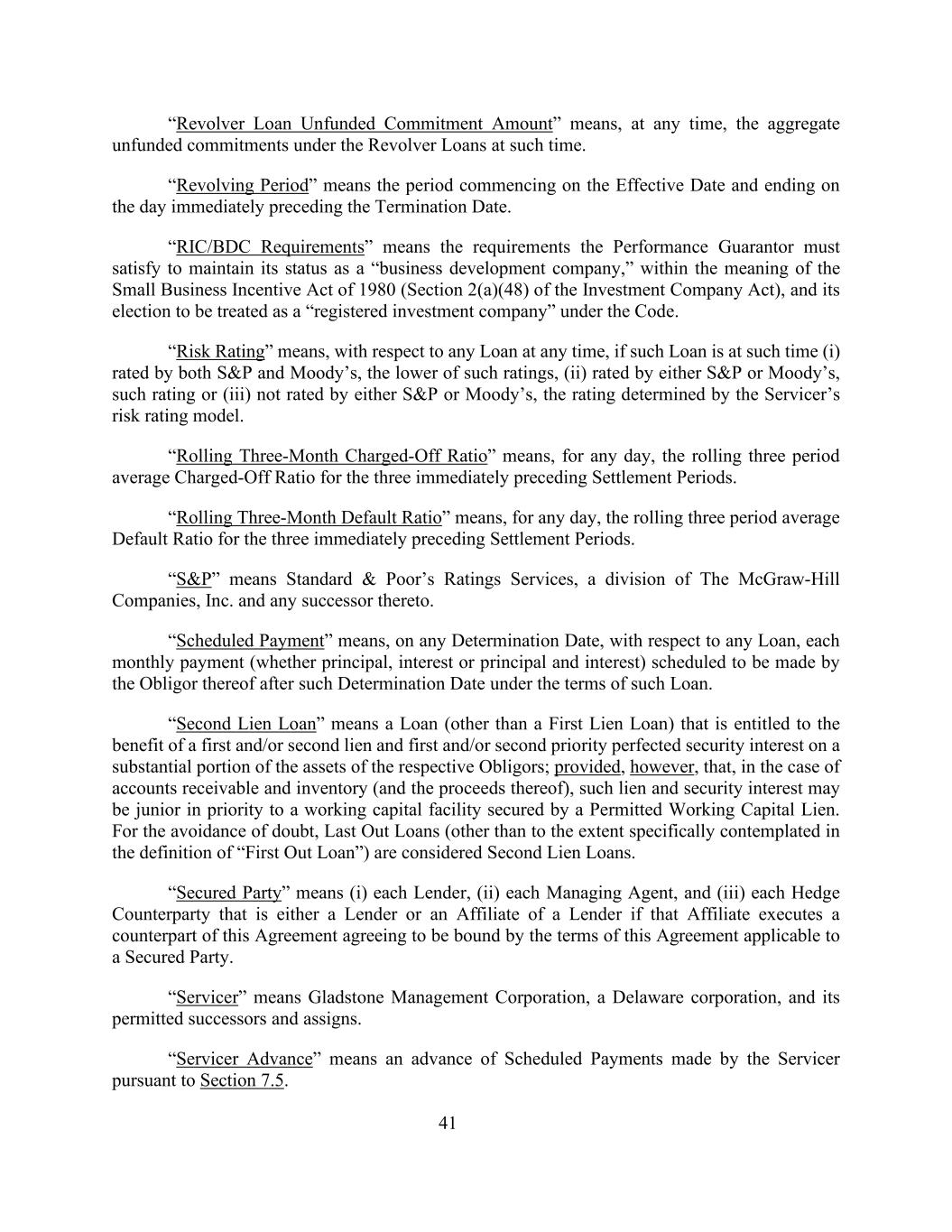 41“Revolver Loan Unfunded Commitment Amount”是指,在任何时候,在该时间,Revolver Loans下的未提供资金的承诺总额。“循环期”是指自生效日起至紧接终止日前一日止的期间。“RIC/BDC要求”是指履约担保人为保持其作为“商业发展公司”的地位而必须满足的要求,这是1980年《小企业激励法案》(《投资公司法》第2(a)(48节)的含义,以及其根据《守则》被视为“注册投资公司”的选择。“风险评级”是指,就任何时间的任何贷款而言,如果该等贷款在该时间(i)获得标普和穆迪的较低者评级,(ii)获得标普或穆迪任一机构的评级,则该等评级或(iii)未获得标普或穆迪任一机构的评级,则为服务商风险评级模型确定的评级。“滚动三个月核销比例”是指,对于任意一天,前三个结算期的滚动三期平均核销比例。“滚动三个月违约率”是指,对于任何一天,前三个结算期的滚动三期平均违约率。“标普”是指标准普尔评级服务公司,麦格劳-希尔公司(McGraw-Hill Companies,Inc.)的一个部门及其任何继任者。“按期付款”是指,在任何确定日期,就任何贷款而言,其债务人在该确定日期后根据该贷款条款计划支付的每个月付款(无论是本金、利息还是本金和利息)。“第二留置权贷款”是指有权获得第一和/或第二留置权以及第一和/或第二优先权完善的担保权益的贷款(第一留置权贷款除外),其对各自债务人的大部分资产;但前提是,在应收账款和存货(及其收益)的情况下,此类留置权和担保权益的优先权可能低于由许可的营运资金留置权担保的营运资金融资。为免生疑问,最后一笔贷款(“先出贷款”定义中具体设想的范围除外)被视为第二留置权贷款。“担保方”是指(i)每个贷款人,(ii)每个管理代理人,以及(iii)每个对冲交易对手,如果该关联公司执行本协议的对应方同意受适用于担保方的本协议条款的约束,则该对冲方要么是贷款人,要么是贷款人的关联公司。“服务商”是指特拉华州公司Gladstone Management Corporation及其允许的继任者和受让人。“服务商垫款”是指服务商根据第7.5节进行的预定付款的垫款。