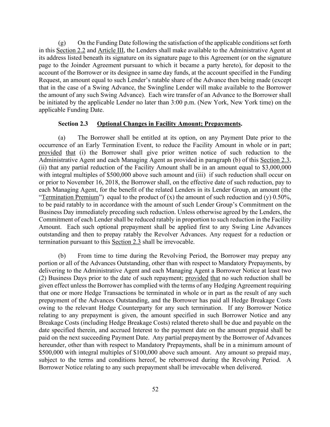 52(g)在满足本条第2.2款和第三条规定的适用条件后的供资日,贷款人应按其在本协议签字页上(或根据其成为本协议一方的《合并协议》签字页上)签字下方所列的地址向行政代理人提供资金,以便存入借款人或其指定人当日账户的资金,存放在资金请求书中规定的账户,相当于该贷款人当时在垫款中的应课税份额的金额(除非在周转垫款的情况下,周转贷款机构将向借款人提供任何此类周转垫款的金额)。向借款人的每笔预付款电汇应由适用的贷款人不迟于适用的融资日期下午3:00(纽约、纽约时间)发起。第2.3节融资金额的可选变动;预付款项。(a)借款人有权在提前终止事件发生前的任何付款日期选择全部或部分减少融资金额;但(i)借款人须按本条第2.3款(b)项的规定,事先向行政代理人及每名管理代理人发出有关减少的书面通知,(ii)任何部分削减融资金额的金额须等于3,000,000美元,并须高于该金额500,000美元的整数倍;及(iii)如该等削减发生在2018年11月16日或之前,借款人须于该等削减的生效日期,为其贷款人集团中的相关贷款人的利益,向每名管理代理人支付一笔金额(“终止溢价”),相等于(x)该等削减金额与(y)0.50%的乘积,按照该贷款人集团在紧接该等减持前一个营业日的承诺金额按比例支付给。除出借人另有约定外,各出借人的承诺应按融资金额减少的比例按比例减少。每笔此类可选预付款应首先适用于任何未偿还的周转额度预付款,然后按比例预付左轮手枪预付款。根据本条第2.3款提出的任何减少或终止请求均不可撤销。(b)在循环期内,借款人可不时预付未偿还的垫款的任何部分或全部,但强制性预付款项除外,通过在此类还款日期前至少两(2)个工作日向行政代理人和每一管理代理人交付借款人通知;但除非借款人已遵守任何套期保值协议的条款,要求一项或多项套期保值交易因任何此类预付未偿预付款而全部或部分终止,且借款人已就任何此类终止支付相关对冲对手方的所有对冲打破成本,否则不得实施此类减少。如发出任何与任何预付款项有关的借款人通知,则该借款人通知所指明的金额及与之有关的任何破碎费用(包括对冲破碎费用)须于该通知所指明的日期到期应付,而预付款项至付款日期的应计利息须于下一个付款日期支付。除强制性预付款外,借款人根据本协议预付的任何部分预付款,最低金额应为500,000美元,高于该金额的整数倍为100,000美元。根据本协议的条款和条件,如此预付的任何金额可在循环期内重新借款。与任何此类提前还款有关的借款人通知在交付时不可撤销。