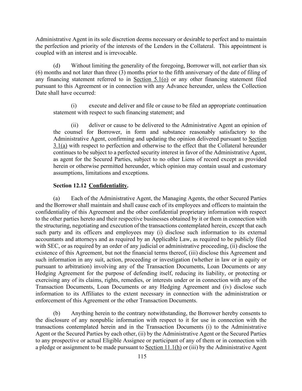 115行政代理人全权酌情认为有必要或可取以完善并维护出借人在抵押品上的利益的完善性和优先权。这项任命附带利益,不可撤销。(d)在不限制前述内容的一般性的情况下,借款人将在不早于第5.1(o)节所指的任何融资报表或根据本协议提交的任何其他融资报表或与本协议项下的任何预付款有关的提交日期的第五个周年日之前的六(6)个月且不迟于三(3)个月,除非收款日期应已发生:(i)就该融资报表执行和交付并归档或安排归档适当的延续报表;(ii)向行政代理人交付或安排交付借款人大律师的意见,其形式和实质合理地令行政代理人满意,确认和更新根据第3.1(a)节就完善性或其他方面交付的意见,大意是本协议项下的担保物继续受制于有利于行政代理人的完善的担保权益,作为有担保方的代理人,除本协议规定或本协议另有许可外,不受其他记录留置权的约束,该意见可能包含通常和习惯的假设、限制和例外。第12.12节保密。(a)每一行政代理人、管理代理人、其他有担保方和借款人应保持并应促使其每一雇员和高级管理人员保持本协议的机密性,以及与本协议的其他当事方及其各自在本协议所设想的交易的结构、谈判和执行中获得的业务有关的其他机密专有信息,但每一此种当事方及其高级管理人员和雇员可(i)向其外部会计师和律师披露此类信息并根据适用法律的要求,根据向SEC公开提交的要求,或根据任何司法或行政程序的命令的要求,(ii)披露本协议的存在,但不披露其财务条款,(iii)在涉及任何交易文件、贷款文件或任何套期保值协议的任何诉讼、诉讼、程序或调查(无论是在法律上或股权上或根据仲裁)中披露本协议和此类信息,以进行自我辩护、减少其责任,或保护或行使其任何索赔、权利、补救措施,或任何交易文件、贷款文件或任何对冲协议项下或与之相关的权益,以及(iv)在与本协议或其他交易文件的管理或执行相关的必要范围内向其关联公司披露此类信息。(b)尽管本文中有任何相反的情况,借款人特此同意披露与其有关的任何非公开信息,以供与本文所设想的交易和交易文件中(i)彼此向行政代理人或有担保当事人披露,(ii)由行政代理人或有担保当事人向其中任何一方的任何潜在或实际合格受让人或参与者披露,或与行政代理人根据第11.1(h)或(iii)条作出的质押或转让有关