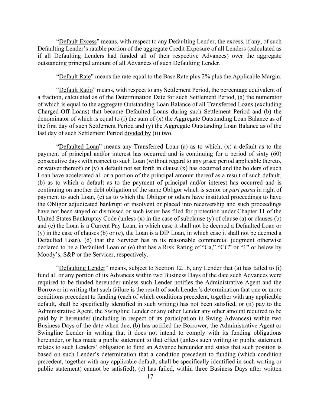 17“违约超额”是指,就任何违约贷款人而言,该违约贷款人在所有贷款人的总信贷敞口中的应课税部分(计算方式如同所有违约贷款人已为其各自的所有垫款提供资金)超过该违约贷款人所有垫款的未偿本金总额的超额部分(如果有的话)。“违约率”是指利率等于基准利率加2%加上适用保证金。“违约比率”是指,就任何结算期而言,截至该结算期的确定日计算的相当于零头的百分比,(a)其分子等于在该结算期内成为违约贷款的所有转让贷款(不包括已注销贷款)的未偿还贷款余额总额,及(b)其分母等于(i)(x)截至该结算期第一天的未偿还贷款余额总额及(y)截至该结算期最后一天的未偿还贷款余额总额除以(ii)二的总和。“违约贷款”是指任何已转让的贷款(a),(x)已发生本金和/或利息支付方面的违约,并就该贷款持续六十(60)天(不考虑适用于该贷款的任何宽限期或豁免),或(y)已发生(x)条未述的违约,且该贷款的持有人已因该违约而加速本金的全部或部分,(b)已发生本金和/或利息支付方面的违约,并正在继续履行同一债务人的另一项债务义务,该债务义务对该贷款具有优先受付权或同等受付权,(c)债务人或其他人已提起程序以使债务人被裁定破产或资不抵债或被置于接管,而该等程序并未被中止或驳回,或该发行人已根据《美国破产法》第11章申请保护(除非(a)条(y)款或(b)及(c)款的情况下(x)该贷款为流动支付贷款,在此情况下,该贷款不应被视为违约贷款,或(b)或(c)款的情况下(y),该贷款为DIP贷款,在这种情况下,不应被视为违约贷款),(d)服务商在其合理的商业判断中已另行宣布为违约贷款,或(e)穆迪、标普或服务商的风险评级分别为“CA”、“CC”或“1”或以下。“违约贷款人”是指,在符合第12.16条的规定下,任何贷款人(a)未能(i)在根据本协议要求为此类垫款提供资金之日起两个营业日内为其全部或任何部分垫款提供资金,除非该贷款人书面通知行政代理人和借款人,该失败是由于该贷款人确定一项或多项提供资金的先决条件(其中每一项先决条件,连同任何适用的违约,均应在此类书面中具体指明)未得到满足,或(ii)向行政代理人付款,Swingline贷款人或任何其他贷款人在到期之日起两个营业日内根据本协议要求其支付的任何其他款项(包括与其参与周转垫款有关的款项),(b)已书面通知借款人、行政代理人或Swingline贷款人其不打算遵守其根据本协议承担的资金义务,或已作出大意如此的公开声明(除非该书面或公开声明涉及该等贷款人根据本协议为预付款提供资金的义务,并声明该立场是基于该贷款人确定无法满足提供资金的先决条件(该先决条件连同任何适用的违约应在该书面或公开声明中具体指明),(c)未能在书面后三个工作日内