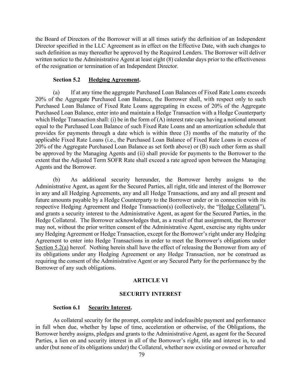 79借款人的董事会将在任何时候满足LLC协议中规定的在生效日期生效的独立董事的定义,并在此后可能获得所需贷款人批准的定义的更改。借款人将在独立董事辞职或终止任职生效至少八(8)个日历日前向行政代理人送达书面通知。第5.2节套期保值协议。(a)如在任何时候,固定利率贷款的购买贷款余额总额超过购买贷款余额总额的20%,借款人只须就该等购买贷款余额总额超过购买贷款余额总额的20%的固定利率贷款,与对冲交易对手订立并维持对冲交易,该对冲交易应:(i)形式为(a)名义金额等于该等固定利率贷款的购买贷款余额的利率上限,以及规定通过适用的固定利率贷款到期后三(3)个月内的日期付款的摊销时间表(即,固定利率贷款的已购贷款余额超过上述已购贷款总余额的20%)或(b)应由管理代理批准的其他形式,以及(ii)应规定支付给借款人的款项,但以调整后的定期SOFR利率应超过管理代理与借款人之间商定的利率为限。(b)作为本协议项下的额外担保,借款人特此将借款人在任何和所有套期保值协议、任何和所有套期保值交易中的所有权利、所有权和权益,以及对冲对手方根据或与其各自的套期保值协议和套期保值交易(统称“对冲质押品”)相关的任何和所有当前和未来应付给借款人的金额(统称“对冲质押品”)转让给作为有担保方代理人的行政代理人在对冲质押品中的担保权益。借款人承认,由于该转让,未经行政代理人事先书面同意,借款人不得行使任何套期保值协议或套期保值交易项下的任何权利,但借款人根据任何套期保值协议有权进行套期保值交易以履行借款人根据本协议第5.2(a)节承担的义务除外。本文中的任何内容均不具有解除借款人在任何套期保值协议或任何套期保值交易项下的任何义务的效力,也不被解释为要求行政代理人或任何担保方同意借款人履行任何此类义务。第六条担保权益第6.1节担保权益。作为及时、完整和不可撤销的付款和到期全额履行债务的抵押担保,无论是通过时间的推移、加速还是其他方式,借款人特此将借款人在担保物上的所有权利、所有权和权益(无论是现在存在的还是拥有的或以后的)上的所有权利、所有权和权益(但不包括其在担保物下的任何义务)上的留置权和担保权益转让、质押和授予行政代理人