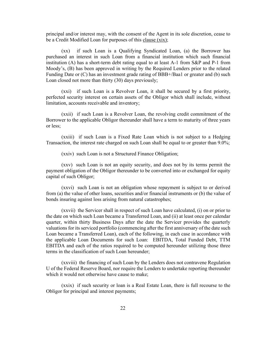 22经代理人全权酌情同意,本金和/或利息可就本条款而言不再是信用修改贷款(xX);(xX)如果此类贷款是合格银团贷款,(a)借款人已从该金融机构购买了该贷款的利息,而该金融机构(a)在标普的短期债务评级至少等于A-1,在穆迪的短期债务评级至少等于P-1,(b)已在相关融资日期前获规定贷款人书面批准,或(c)投资级别评级为BBB +/Baa1或更高,及(b)该等贷款于不多于三十(30)天前结清;(xxi)如该等贷款为循环贷款,则该贷款须以债务人若干资产的第一优先权、完善的担保权益作担保,该等资产应包括但不限于应收账款及存货;(xxii)如该等贷款为循环贷款,借款人对其项下适用的债务人的循环信贷承诺的到期期限应为三年或更短;(二十三)如该贷款为固定利率贷款且不受套期保值交易限制,则该贷款收取的利率应等于或高于9.0%;(二十四)该贷款不属于结构性融资义务;(二十五)该贷款不属于股权证券,并且根据其条款,不允许债务人根据其所承担的付款义务转换为或交换为该债务人的股本;(xxvi)该贷款不是一项债务,其偿还受制于或源自(a)其他贷款、证券和/或金融工具的价值或(b)为自然灾害引起的损失提供保险的债券的价值;(xxvii)就该贷款而言,服务商应已计算出,(i)在该贷款成为已转让贷款之日或之前,以及(ii)每个日历季度至少一次,在服务商提供其所服务的投资组合的季度估值之日起三十个工作日内(从该贷款成为转让贷款之日起一周年之后开始),在每种情况下,按照该贷款的适用贷款文件进行以下各项估值:EBITDA、已融资债务总额、TTM EBITDA以及本协议项下使用该三个术语在本协议项下对该贷款进行分类时需要计算的每个比率;(xxviii)贷款人为该贷款提供的融资不违反联邦储备委员会第U条规定,也不要求出借人承担其原本没有理由作出的报告;(xxix)如该等担保或贷款为不动产贷款,则对债务人的本金和利息支付有充分追索权;