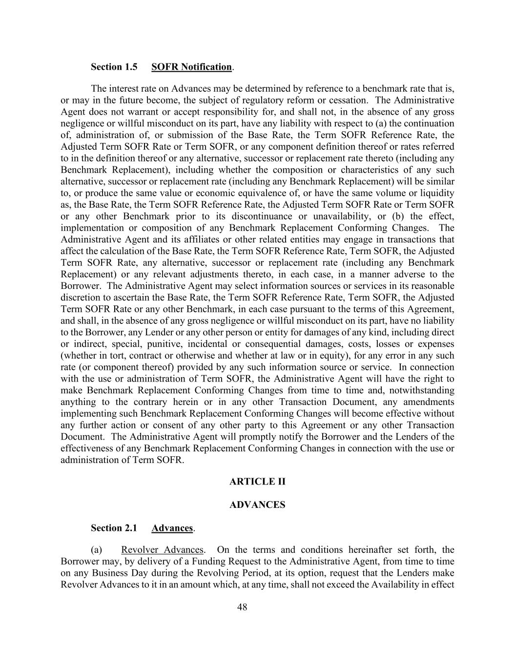 48第1.5节SOFR通知。垫款利率可参照基准利率确定,该基准利率是或将来可能成为监管改革或停止的对象。行政代理人不保证或承担责任,且在其没有任何重大疏忽或故意不当行为的情况下,不对(a)基本利率、定期SOFR参考利率、调整后定期SOFR利率或定期SOFR的延续、管理或提交,或其定义中提及的任何组成部分定义或费率或其任何替代、继承或替代利率(包括任何基准替代)承担任何责任,包括任何此类替代的组成或特征,继任者或更换率(包括任何基准更换率)将与基本利率、定期SOFR参考利率、调整后的定期SOFR利率或定期SOFR或任何其他基准在其终止或不可用之前相似,或产生相同的价值或经济等价物,或具有相同的数量或流动性,或(b)任何基准更换率的效果、实施或构成符合变化。行政代理人及其附属机构或其他相关实体可能在每种情况下以对借款人不利的方式从事影响计算基本利率、定期SOFR参考利率、定期SOFR、调整后定期SOFR利率、任何替代、继承或替代利率(包括任何基准替代)或对其进行任何相关调整的交易。行政代理人可在其合理酌情权下选择信息来源或服务,以确定基本利率、定期SOFR参考利率、定期SOFR、调整后的定期SOFR利率或任何其他基准,在每种情况下均依据本协议的条款,并且在其本人没有任何重大过失或故意不当行为的情况下,对借款人、任何贷款人或任何其他个人或实体不承担任何损害赔偿责任,包括直接或间接、特殊、惩罚性、附带或后果性损害、成本、损失或费用(无论是侵权行为,合同或其他,无论是在法律上还是在权益上),针对任何此类信息源或服务提供的任何此类费率(或其组成部分)中的任何错误。就Term SOFR的使用或管理而言,行政代理人将有权不时进行基准替换符合性变更,尽管本文或任何其他交易文件中有任何相反的规定,实施此类基准替换符合性变更的任何修订将生效,而无需本协议或任何其他交易文件的任何其他方采取任何进一步行动或同意。行政代理人将及时通知借款人和贷款人与使用或管理定期SOFR相关的任何基准替换符合性变更的有效性。第二条垫付2.1节预付款。(a)左轮手枪预付款。根据以下规定的条款和条件,借款人可在循环期内的任何营业日不时通过向行政代理人交付资金请求,根据其选择,要求贷款人向其提供循环预付款,其金额在任何时候均不得超过有效的可得