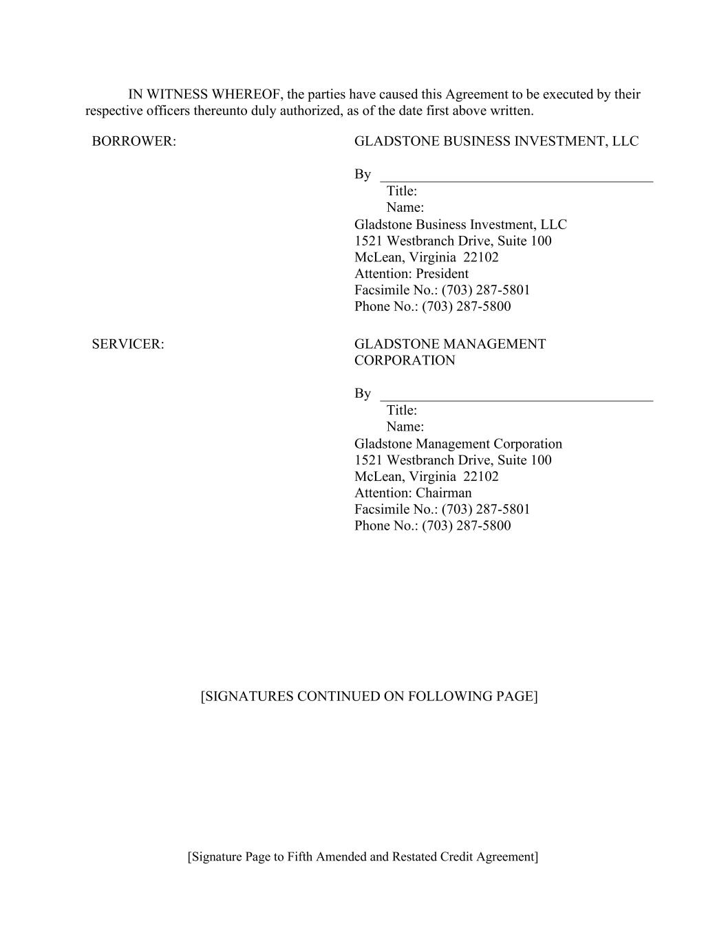 [签署页至第五份经修订和重述的信贷协议]作为证明,双方已安排本协议由各自的高级管理人员正式授权签署,截至上述第一个书面日期。Borrower:Gladstone Business Investment,LLC按标题:Name:Gladstone Business Investment,LLC 1521 Westbranch Drive,Suite 100 McLean,Virginia 22102注意:总裁传真号码:(703)287-5801电话号码:(703)287-5800服务人员:Gladstone Management Corporation按标题:Name:Gladstone Management Corporation 1521 Westbranch Drive,Suite 100 McLean,Virginia 22102注意:主席传真号码:(703)287-5801电话号码:(703)287-5800 [签名续]