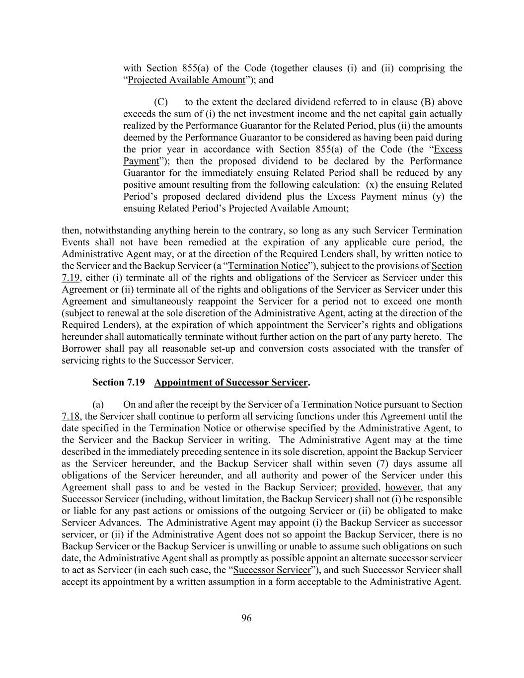 96与守则第855(a)条(连同第(i)及(ii)条,包括“预计可用金额”);及(c)如上文(b)条所指的已宣布股息超过(i)相关期间的履约保证人实际实现的净投资收益及净资本收益之和,加上(ii)履约保证人根据《守则》第855(a)条视为已于上一年度支付的金额(“超额付款”);则履约保证人将于紧接下一个相关期间宣派的建议股息须按以下计算所产生的任何正数减少:(x)下一个相关期间的建议宣派股息加上超额付款减去(y)下一个相关期间的预计可用金额;然后,尽管本文有任何相反的规定,只要任何该等服务人终止事件在任何适用的补救期届满时仍未得到补救,行政代理人可或在规定贷款人的指示下,在符合第7.19条规定的情况下,以书面通知服务人及备用服务人(“终止通知”),(i)终止本协议项下作为服务人的服务人的所有权利和义务或(ii)终止本协议项下作为服务人的所有权利和义务,并同时重新任命服务人,期限不超过一个月(可由行政代理人全权酌情决定续签,并按所需贷款人的指示行事),在此任期届满时,服务人在本协议项下的权利和义务应自动终止,无需任何一方采取进一步行动。借款人应向继任服务人支付与服务权转让相关的所有合理设置和转换费用。第7.19条委任继任服务人。(a)在服务人依据第7.18条收到终止通知之日及之后,服务人须继续履行本协议项下的所有服务职能,直至终止通知所指明或行政代理人另有指明的日期,以书面向服务人及后备服务人作出。行政代理人可在紧接前一句所述的时间全权酌情指定备用服务商为本协议项下的服务商,备用服务商应在七(7)天内承担该服务商在本协议项下的所有义务,该服务商在本协议项下的所有权力和权力应传递给并归属于备用服务商;但条件是,任何继任服务商(包括但不限于备用服务商)不应(i)对离任服务商的任何过去作为或不作为负责或承担责任,或(ii)有义务进行服务商垫款。行政代理人可以指定(i)后备服务人为继任服务人,或(ii)如果行政代理人未如此指定后备服务人、在该日期没有后备服务人或后备服务人不愿意或不能承担该义务,则行政代理人应尽快指定一名候补继任服务人担任服务人(在每种情况下称为“继任服务人”),该继任服务人应以行政代理人可接受的形式以书面承担方式接受其任命。