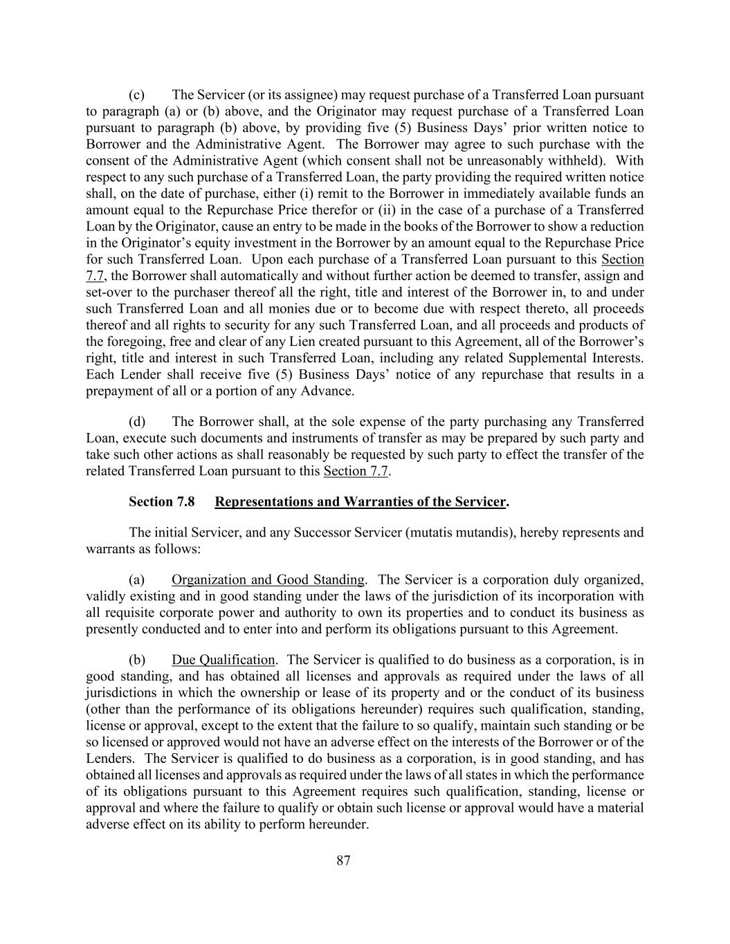 87(c)服务人(或其受让人)可根据上文(a)或(b)段要求购买已转让贷款,而发起人可根据上文(b)段要求购买已转让贷款,方法是向借款人和行政代理人提供五(5)个工作日前的书面通知。借款人经行政代理人同意(不得无理拒绝同意),可以约定购买。就任何此类购买转让贷款而言,提供所需书面通知的一方应在购买之日(i)以立即可用的资金向借款人汇出相当于其回购价格的金额,或(ii)在发起人购买转让贷款的情况下,促使在借款人的账簿上作出记项,以显示发起人对借款人的股权投资减少相当于该转让贷款的回购价格的金额。在根据本条第7.7款每购买一笔转让贷款时,借款人应自动且无需采取进一步行动,视为将借款人在该转让贷款中、在该转让贷款中和在该转让贷款下的所有权利、所有权和利息以及与该转让贷款有关的所有到期或将要到期的款项、其所有收益和任何该转让贷款的所有担保权,以及上述所有收益和产品,不受根据本协议设定的任何留置权的影响,将借款人的所有权利,此类转让贷款的所有权和权益,包括任何相关的补充权益。每个贷款人应收到五(5)个工作日的回购通知,任何回购导致提前偿还全部或部分预付款。(d)借款人须在购买任何已转让贷款的一方的全部费用下,签立该一方可能拟备的转让文件及文书,并采取该一方合理要求的其他行动,以便依据本条第7.7条将有关的已转让贷款转让。第7.8节服务商的陈述和保证。初始服务商和任何继任服务商(比照),在此声明和保证如下:(a)组织和良好信誉。服务商是一家正式组织、有效存在并在其成立法团的司法管辖区法律下具有良好信誉的公司,拥有所有必要的公司权力和权力,以拥有其财产并按目前的方式开展其业务,并根据本协议订立和履行其义务。(b)适当资格。服务人有资格作为公司开展业务,信誉良好,并已根据其财产所有权或租赁和/或其业务的开展(履行其在本协议下的义务除外)所要求的所有法域的法律获得所有许可和批准,但未能保持这种资格、保持这种地位或获得这种许可或批准不会对借款人或贷款人的利益产生不利影响的情况除外。服务商有资格作为一家公司开展业务,信誉良好,并已按照所有州的法律要求获得所有许可和批准,在这些州履行其根据本协议承担的义务需要此类资格、地位、许可或批准,如果未能获得资格或获得此类许可或批准将对其根据本协议履行的能力产生重大不利影响。