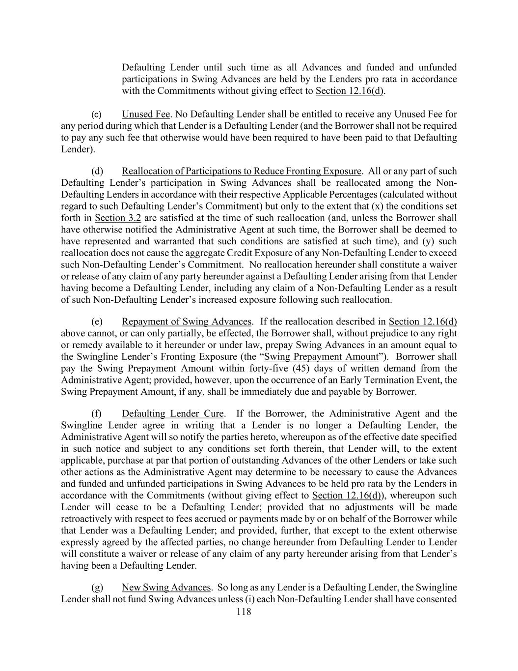 118个违约贷款人,直至所有预付款以及周转预付款的有资金和无资金参与由贷款人根据承诺按比例持有,而不影响第12.16(d)节。(c)未使用费用。任何违约贷款人均无权在该贷款人为违约贷款人的任何期间收取任何未使用的费用(且借款人不应被要求支付任何本应被要求支付给该违约贷款人的此类费用)。(d)重新分配参与以减少前沿暴露。该等违约贷款人参与周转垫款的全部或任何部分应在非违约贷款人之间按照其各自适用的百分比(计算时不考虑该违约贷款人的承诺)重新分配,但仅限于(x)在该重新分配时满足第3.2节规定的条件(并且,除非借款人当时已另行通知行政代理人,借款人应被视为已代表并保证该等条件在该时间得到满足),(y)此类重新分配不会导致任何非违约贷款人的总信用敞口超过该非违约贷款人的承诺。本协议项下的任何重新分配均不构成对本协议项下任何一方针对已成为违约贷款人的违约贷款人提出的任何债权的放弃或解除,包括非违约贷款人因该非违约贷款人在此种重新分配后增加风险敞口而提出的任何债权。(e)偿还周转预付款。如果上述第12.16(d)节所述的重新分配不能或只能部分进行,则借款人应在不损害其根据本协议或根据法律可获得的任何权利或补救的情况下,预付相当于Swingline贷款人的前期风险敞口的金额(“周转预付款金额”)的周转预付款。借款人应在行政代理人提出书面要求后的四十五(45)天内支付周转预付款金额;但条件是,一旦发生提前终止事件,周转预付款金额(如有)应立即到期并由借款人支付。(f)违约贷款人补救办法。如果借款人、行政代理人和Swingline贷款人书面同意贷款人不再是违约贷款人,则行政代理人将如此通知双方,据此,自该通知指明的生效日期起并在符合其中所列任何条件的情况下,该贷款人将在适用的范围内,按面值购买其他贷款人的未偿还预付款部分,或采取行政代理人可能认为必要的其他行动,以促使贷款人根据承诺按比例持有预付款以及已出资和未出资参与周转预付款(不影响第12.16(d)节),据此,该贷款人将不再是违约贷款人;前提是,在该贷款人是违约贷款人期间,不会对由借款人或代表借款人应计的费用或付款进行追溯调整;并且,此外,除受影响各方另有明确约定的范围外,本协议项下从违约贷款人变为贷款人的任何变更均不构成对本协议项下任何一方因其一直是违约贷款人而产生的任何债权的放弃或解除。(g)新的周转进展。只要任何贷款人是违约贷款人,Swingline贷款人不得为周转垫款提供资金,除非(i)每个非违约贷款人均已同意