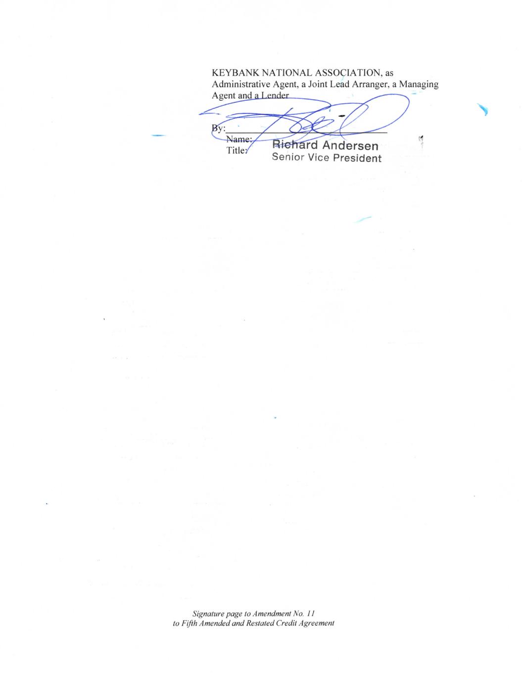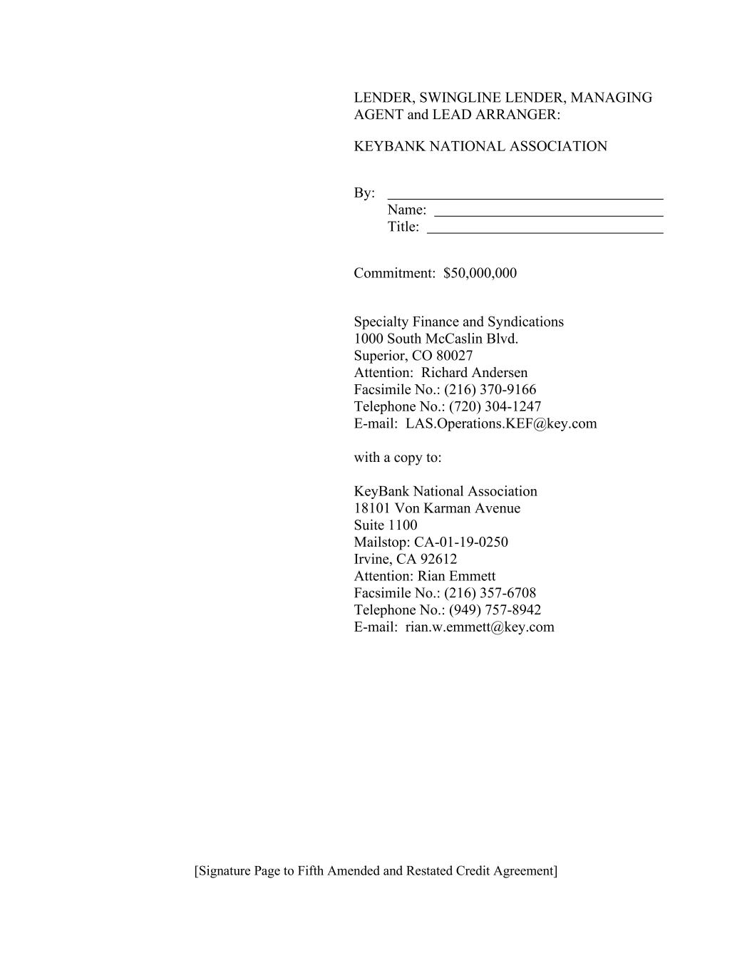 [签署页至第五次修订和重述的信贷协议]贷款人、SWINGLINE贷款人、管理代理人和主要安排人:KEYBANK NATIONAL Association by:Name:Title:Commitment:$ 50,000,000 Specialty Finance and Syndications 1000 South McCaslin Blvd. Superior,CO 80027收件人:Richard Andersen传真号码:(216)370-9166电话号码:(720)304-1247邮箱:LAS.Operations.KEF@key.com并抄送:KeyBank National Association 18101 von Karman Avenue Suite 1100 Mailstop:CA-01-19-0250 Irvine,加利福尼亚州 92612收件人:Rian Emmett传真号码: