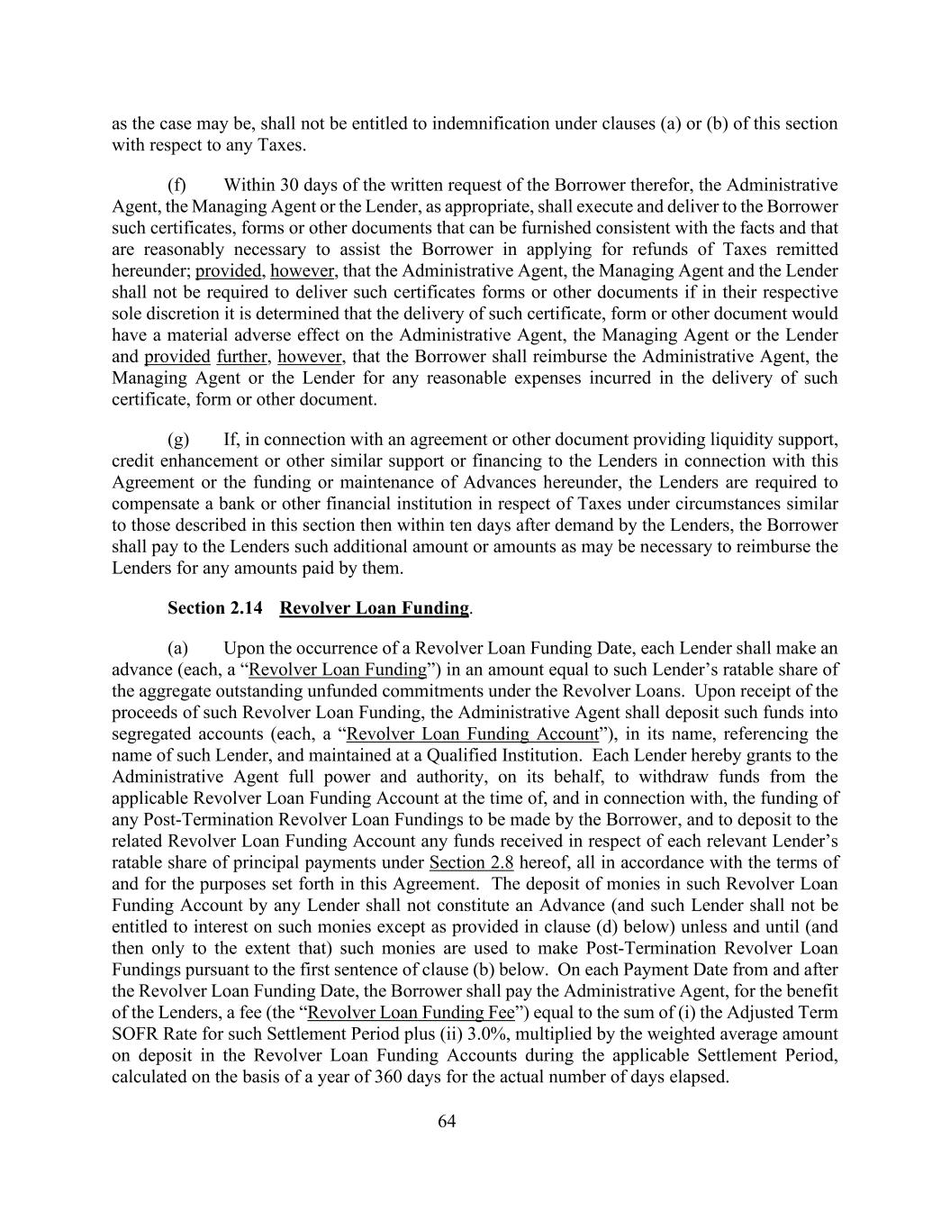 64(视属何情况而定)无权根据本条(a)或(b)条就任何税项获得弥偿。(f)在借款人提出书面要求后30天内,行政代理人、管理代理人或贷款人(视情况而定)应签立并向借款人交付能够提供的与事实相符且为协助借款人申请退还根据本协议汇出的税款而合理必要的证明、表格或其他文件;但条件是,行政代理人,如果管理代理人和贷款人各自酌情决定交付此类证书、表格或其他文件将对行政代理人、管理代理人或贷款人产生重大不利影响,但进一步规定借款人应偿还行政代理人、管理代理人或贷款人在交付此类证书、表格或其他文件方面发生的任何合理费用,则不应要求其交付此类证书、表格或其他文件。(g)如果就与本协议有关的向贷款人提供流动性支持、信用增进或其他类似支持或融资的协议或其他文件或根据本协议提供的垫款的资金或维持,要求贷款人在与本节所述情况类似的情况下就税款向银行或其他金融机构作出补偿,则在贷款人提出要求后十天内,借款人应向贷款人支付可能需要的额外金额或金额,以偿还贷款人所支付的任何金额。第2.14款循环贷款资金。(a)一旦出现循环贷款供资日期,每个贷款人应提供一笔预付款(每笔为“循环贷款供资”),数额相当于该贷款人在循环贷款项下未供资承付款项总额中的应课税份额。行政代理人收到此种循环贷款资金的收益后,应将此种资金存入独立的账户(每个账户,一个“循环贷款资金账户”),以其名义,参照该贷款人的名义,并在合格机构进行维护。每一贷款人特此授予行政代理人充分权力和授权,代表其在借款人将提供的任何终止后循环贷款资金的资金时以及与之相关的情况下从适用的循环贷款资金账户中提取资金,并将就每一相关贷款人根据本协议第2.8节在本金支付中的应课税份额而收到的任何资金存入相关的循环贷款资金账户,所有这些都符合本协议的条款并为本协议规定的目的。任何贷款人将款项存入该循环贷款资金账户不构成垫款(且该贷款人无权就该等款项获得利息,但下文(d)条规定的除外),除非且直至(然后仅限于)该等款项根据下文(b)条第一句用于提供终止后循环贷款资金。自循环贷款融资日期起及之后的每个付款日期,借款人应为贷款人的利益,向行政代理人支付一笔费用(“循环贷款融资费用”),该费用等于(i)该结算期的调整后定期SOFR利率加上(ii)3.0%的总和,乘以适用结算期内循环贷款融资账户的加权平均存款金额,按实际经过天数的一年360天计算。