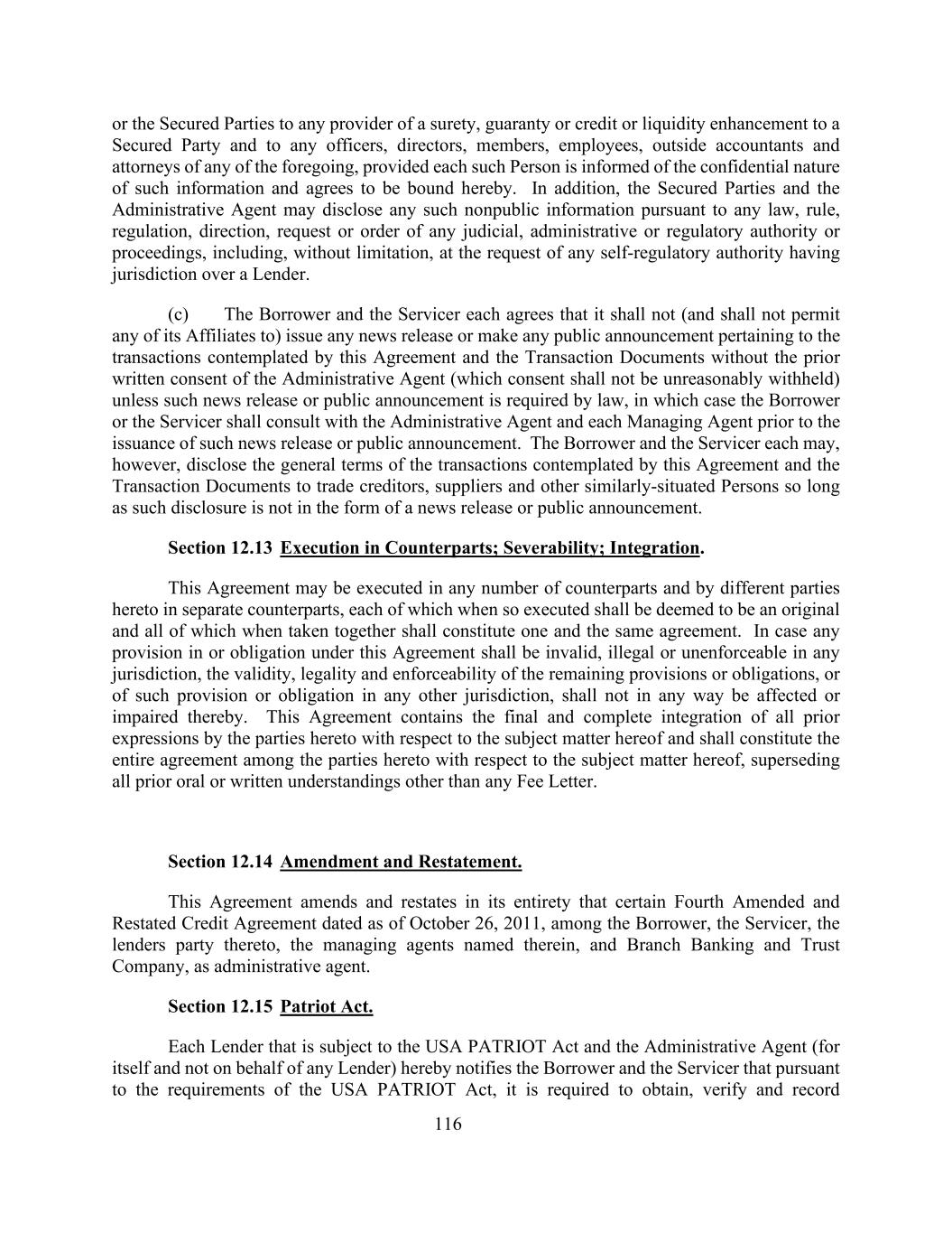 116或任何向有担保方和任何上述任何一方的高级职员、董事、成员、雇员、外部会计师和律师提供担保、担保或信用或流动性增强的任何提供者的有担保方,前提是每一此类人被告知此类信息的保密性质并同意在此受约束。此外,有担保当事人和行政代理人可以根据任何司法、行政或管理当局或程序的任何法律、规则、条例、指示、请求或命令,包括但不限于应对贷款人具有管辖权的任何自律管理当局的请求,披露任何此类非公开信息。(c)借款人和服务人各自同意,未经行政代理人事先书面同意(不得无理拒绝同意),不得(也不得允许其任何关联机构)发布与本协议和交易文件所设想的交易有关的任何新闻稿或公告,除非法律要求发布该新闻稿或公告,在这种情况下,借款人或服务人应在发布该新闻稿或公告之前咨询行政代理人和各管理代理人。然而,借款人和服务商可各自向贸易债权人、供应商和其他类似情况的人披露本协议和交易文件所设想的交易的一般条款,只要此类披露不是以新闻稿或公告的形式。第12.13节对应方执行;可分割性;整合性。本协议可由任意数目的对应方签署,也可由不同的对应方在不同的对应方签署,每一方如此签署时应被视为正本,所有这些合并在一起应构成同一份协议。如本协议中的任何条款或义务在任何司法管辖区无效、非法或不可执行,则其余条款或义务或该等条款或义务在任何其他司法管辖区的有效性、合法性和可执行性不因此而受到任何影响或损害。本协议包含本协议各方就本协议标的事项的所有先前表述的最终和完整整合,并应构成本协议各方就本协议标的事项的全部协议,取代除任何费用信函之外的所有先前口头或书面谅解。第12.14节修正和重述。本协议对作为行政代理人的借款人、服务商、贷款方、其中指定的管理代理人和分行银行信托公司之间日期为2011年10月26日的某些第四次经修订和重述的信贷协议进行了全部修订和重申。第12.15节《爱国者法案》。受《美国爱国者法》约束的每个贷款人和行政代理人(为其本身而不是代表任何贷款人)特此通知借款人和服务人,根据《美国爱国者法》的要求,它需要获得、核实和记录