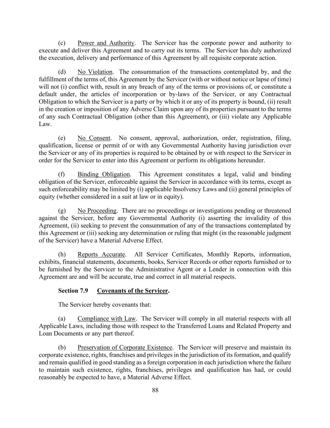 88(c)权力和权威。服务商拥有执行和交付本协议以及履行其条款的公司权力和权力。服务商已通过所有必要的公司行动正式授权执行、交付和履行本协议。(d)没有违反。服务商完成本协议所设想的交易和履行本协议的条款(无论是否有通知或时间流逝)将不会(i)与服务商的公司章程或细则,或服务商作为一方当事人或其或其任何财产受其约束的任何合同义务发生冲突、导致违反任何条款或规定,或构成违约,(ii)导致依据任何该等合约义务的条款(本协议除外)对其任何财产产生或施加任何不利债权,或(iii)违反任何适用法律。(e)没有同意。没有任何同意、批准、授权、命令、登记、备案、资格、许可或许可任何对服务商或其任何财产具有管辖权的政府当局或与之相关的任何政府当局的同意、批准、授权、许可或许可,均无须由服务商获得或就服务商获得,以使服务商订立本协议或履行其在本协议下的义务。(f)具有约束力的义务。本协议构成服务商的一项合法、有效和具有约束力的义务,可根据其条款对服务商强制执行,除非此类可执行性可能受到(i)适用的破产法和(ii)一般公平原则(无论是在法律诉讼中还是在公平中考虑)的限制。(g)无程序。在任何政府当局(i)断言本协议无效、(ii)试图阻止本协议所设想的任何交易的完成或(iii)寻求任何可能(在服务商的合理判断中)产生重大不利影响的确定或裁决之前,没有任何针对服务商的未决或威胁的诉讼或调查。(h)报告准确。所有与本协议有关的服务商证书、月度报告、信息、证物、财务报表、文件、簿册、服务商记录或其他由服务商向行政代理人或贷款人提供或将提供的报告,在所有重大方面都是并将是准确、真实和正确的。第7.9条服务人的盟约。服务商在此承诺:(a)遵守法律。服务商将在所有重大方面遵守所有适用法律,包括与转让贷款及相关财产和贷款文件或其任何部分有关的法律。(b)维护公司存在。服务商将在其成立的司法管辖区内维护和维持其公司存在、权利、特许和特权,并在未能维持此类存在、权利、特许、特权和资格已经或可以合理预期会产生重大不利影响的每个司法管辖区内,作为并保持作为外国公司的良好信誉的资格。