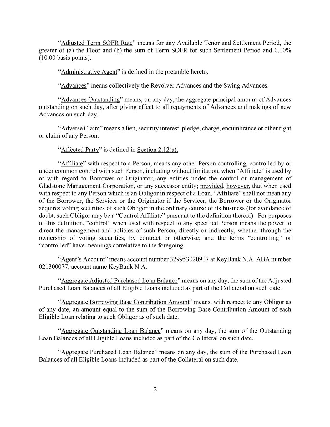 2“调整后的期限SOFR率”是指对于任何可用的期限和结算期,(a)下限和(b)该结算期的期限SOFR之和与0.10%(10.00个基点)中的较大者。“行政代理人”定义于本协议序言部分。“前进”是指左轮式前进和摇摆式前进的统称。“未偿还垫款”是指,在任何一天,在该日所有偿还垫款和在该日进行新的垫款后,在该日未偿还垫款的本金总额。“反向债权”是指任何人的留置权、担保权益、质押、押记、产权负担或其他权利或债权。“受影响方”在第2.12(a)节中定义。就某人而言,“关联关系”是指控制、控制或与该人共同控制的任何其他人,包括但不限于当“关联关系”被借款人或发起人、Gladstone Management Corporation控制或管理下的任何实体或任何继承实体使用或与之相关时;但是,就就任何就贷款而言是义务人的人而言,“关联关系”不是指任何借款人、服务商或发起人,如果服务商,借款人或发起人在其正常业务过程中获得该债务人的有表决权证券(为免生疑问,该债务人可根据其定义为“控制关联公司”)。就本定义而言,“控制”在用于任何特定人员时,是指直接或间接地指导该人员的管理和政策的权力,无论是通过投票证券的所有权、通过合同或其他方式;而“控制”或“受控”一词具有与上述相关的含义。“代理账户”是指KeyBank N.A. ABA编号021300077的账号329953020917,账户名称KeyBank N.A.“调整后购买贷款余额总额”是指在任何一天,在该日期作为部分抵押品包括的所有合格贷款的调整后购买贷款余额之和。“总借款基础缴款金额”是指,就截至任何日期的任何债务人而言,金额等于截至该日期与该债务人有关的每笔合格贷款的借款基础缴款金额之和。“未偿还贷款余额总额”是指在任何一天,在该日期作为部分抵押品包括的所有合格贷款的未偿还贷款余额之和。“已购买贷款余额总额”是指在任何一天,在该日期作为抵押品的一部分包括在内的所有合格贷款的已购买贷款余额之和。