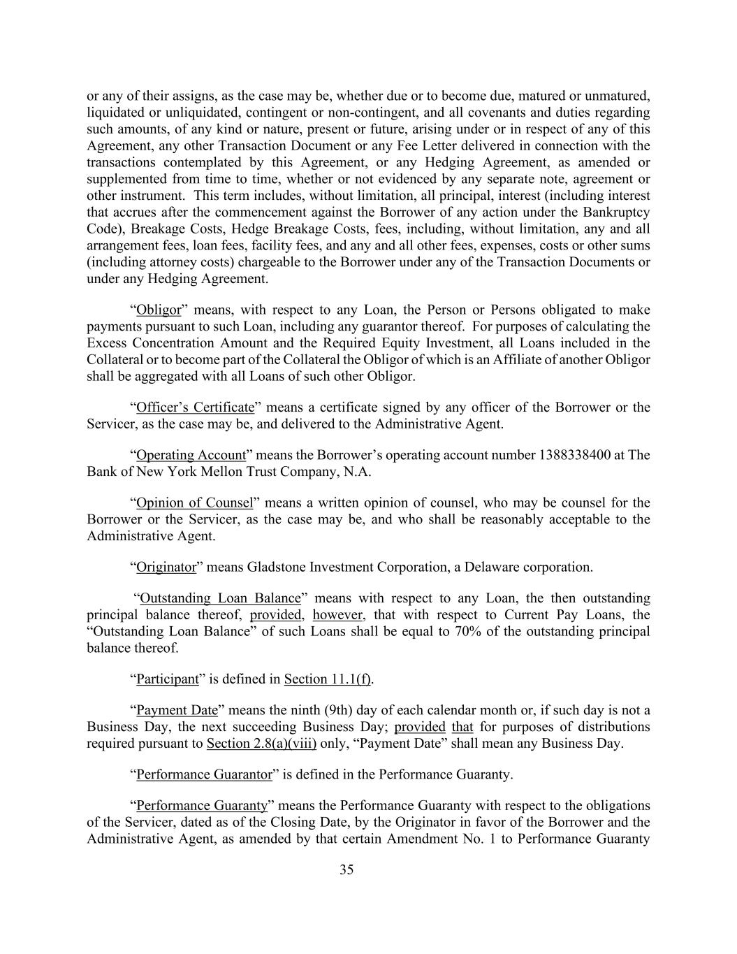 35或其任何受让人(视属何情况而定),不论是否到期或即将到期、到期或未到期、已清算或未清算、或有或非或有,以及与根据或就本协议、任何其他交易文件或就本协议所设想的交易交付的任何费用函件或任何套期保值协议(经不时修订或补充)而产生的任何种类或性质的该等金额有关的所有契诺及责任,不论是否由任何单独的票据、协议或其他文书证明。该条款包括但不限于所有本金、利息(包括根据《破产法》对借款人提起的任何诉讼开始后产生的利息)、破产成本、对冲破产成本、费用,包括但不限于任何和所有安排费用、贷款费用、设施费用,以及根据任何交易文件或任何对冲协议应向借款人收取的任何和所有其他费用、开支、成本或其他款项(包括律师费用)。“债务人”是指,就任何贷款而言,根据此类贷款有义务付款的个人或个人,包括其任何担保人。为计算超额集中金额和所需的股权投资,包括在抵押品中的所有贷款或成为抵押品的一部分而其债务人是另一债务人的附属公司的所有贷款应与该另一债务人的所有贷款合并。“官员证书”是指由借款人或服务人(视情况而定)的任何官员签署并交付给行政代理人的证书。“操作账户”是指借款人在纽约梅隆银行信托公司的操作账号1388338400,N.A.“律师意见”是指大律师的书面意见,大律师可能是借款人的大律师或服务人(视情况而定)的大律师,行政代理人应能合理接受大律师的书面意见。“鼻祖”是指Gladstone Investment Corporation,一家特拉华州公司。“未偿贷款余额”是指就任何贷款而言,其当时的未偿本金余额,但前提是,就当期支付贷款而言,此类贷款的“未偿贷款余额”应等于其未偿本金余额的70%。第11.1(f)节对“参与者”进行了定义。“付款日期”是指每个日历月的第九(9)天,如果该日不是营业日,则为下一个营业日;但仅就根据第2.8(a)(viii)条所要求的分配而言,“付款日期”是指任何营业日。履约保函中对“履约保证人”进行了定义。“履约担保”指与服务人义务有关的履约担保,日期为截止日期,由发起人以借款人和行政代理人为受益人,并经履约担保的该特定修订第1号修订