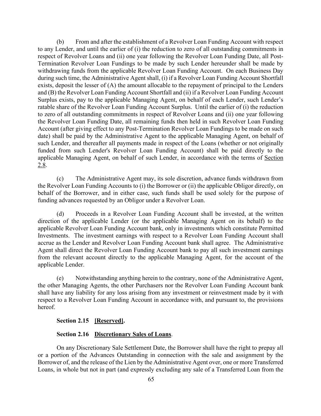 65(b)自就任何贷款人设立循环贷款资金账户之日起及之后,直至(i)关于循环贷款的所有未偿承付款减至零和(ii)循环贷款资金提供日期后一年(以较早者为准),该贷款人根据本协议拟作出的所有终止后循环贷款资金均应通过从适用的循环贷款资金账户中提取资金的方式作出。在这段时间内的每个营业日,行政代理人应(i)如果存在循环贷款资金账户短缺,存入(a)可分配给贷款人偿还本金的金额和(b)循环贷款资金账户短缺中的较低者,以及(ii)如果存在循环贷款资金账户盈余,则代表每个贷款人向适用的管理代理人支付该贷款人在循环贷款资金账户盈余中的应课税份额。直至(i)将有关循环贷款的所有未偿还承付款减至零及(ii)循环贷款供资日期后一年(以较早者为准),该循环贷款供资账户中当时持有的所有剩余资金(在使将于该日期作出的任何终止后循环贷款供资生效后)应由行政代理人代表该贷款人向适用的管理代理人支付,此后,就贷款支付的所有款项(无论最初是否由该贷款人的循环贷款资金账户提供资金)应根据第2.8节的条款代表该贷款人直接支付给适用的管理代理。(c)行政代理人可全权酌情将从循环贷款资金账户中提取的资金直接代表借款人垫付给(i)借款人或(ii)适用的债务人,在任何一种情况下,这些资金应仅用于债务人根据循环贷款要求的垫款。(d)循环贷款筹资账户的收益应根据适用的贷款人(或代表其的适用管理代理人)的书面指示投资于适用的循环贷款筹资账户银行,仅投资于构成许可投资的投资。循环贷款资金账户的投资收益应按贷款人和循环贷款资金账户银行的约定累计。行政代理人应指示Revolver贷款资金账户银行将相关账户的所有此类投资收益直接支付给适用的管理代理人,为适用的贷款人的账户。(e)尽管本协议另有相反规定,行政代理人、其他管理代理人、其他买方或循环贷款资金账户银行均不对其根据本协议的规定并依据本协议的规定就循环贷款资金账户进行的任何投资或再投资所产生的任何损失承担任何责任。第2.15节[保留]。第2.16节酌情出售贷款。在任何全权出售结算日,借款人有权将与借款人出售和转让一笔或多笔转让贷款、以及行政代理人解除对一笔或多笔转让贷款的留置权有关的全部或部分未偿还垫款全部而非部分预付(并明确将转让贷款的任何出售从