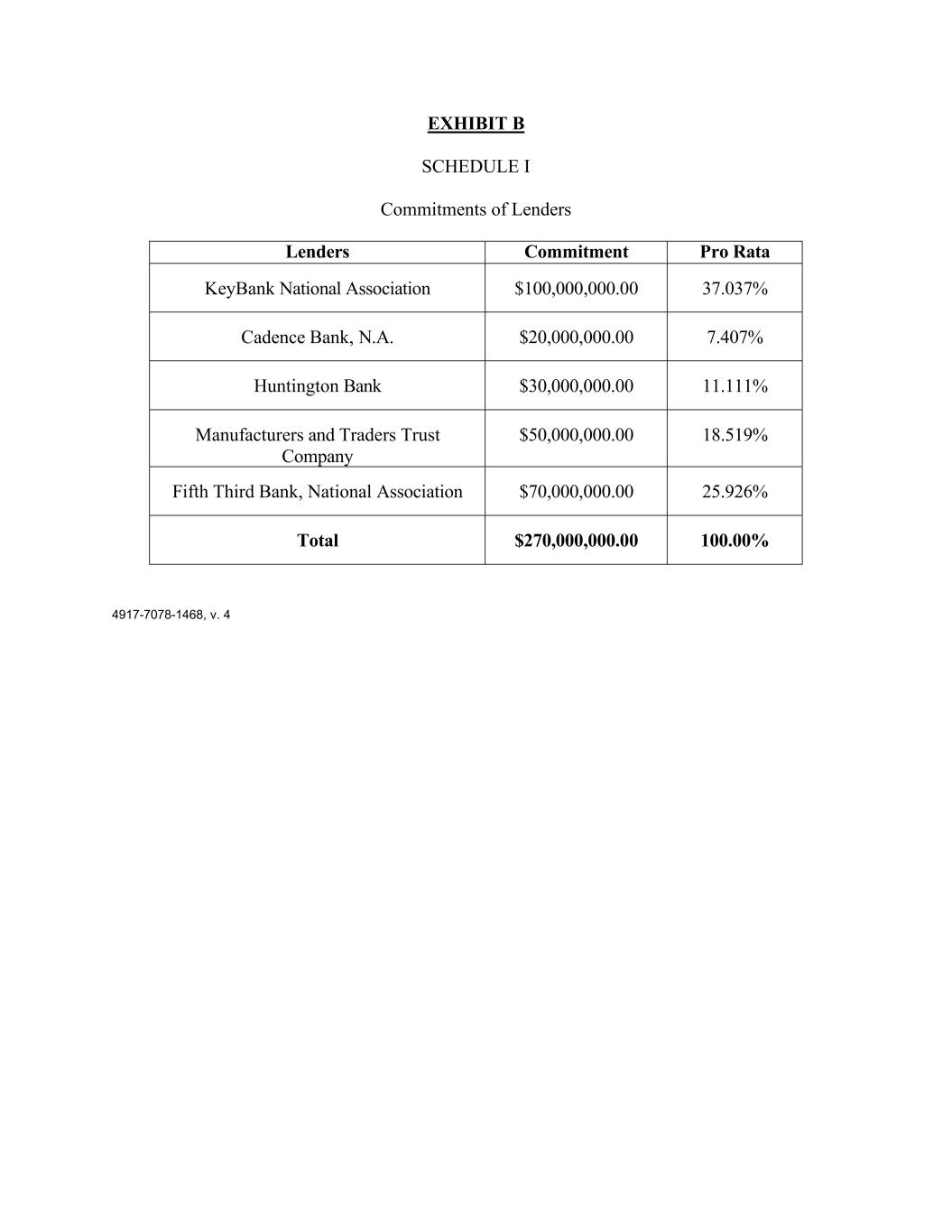 表B附表I贷款人的承诺贷款人按比例承诺KeyBank National Association $ 100,000,000.00 37.037% Cadence Bank,N.A. $ 20,000,000.00 7.407% Huntington Bank $ 30,000,000.00 11.111% Manufacturers and Traders Trust Company $ 50,000,000.00 18.5 19% 五三银行 Bank,National Association $ 70,000,000.00 25.9 26% total $ 270,000,000.00 100.00% 4917-7078-1468,v.4