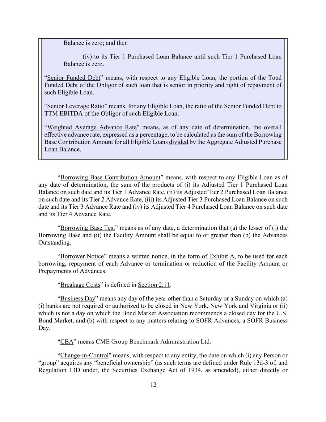 12余额为零;然后(iv)到其一级购买贷款余额,直到该一级购买贷款余额为零。“优先融资债务”是指,就任何合格贷款而言,该贷款的债务人的总融资债务中优先于该合格贷款的优先权和受偿权的部分。“优先杠杆比率”是指,对于任何符合条件的贷款,优先融资债务与该等符合条件贷款的债务人的TTM EBITDA的比率。“加权平均预付率”是指,截至任何确定日期,以百分比表示的总体有效预付率计算为所有符合条件的贷款的借款基础贡献金额之和除以调整后的购买贷款余额总额。“借款基础供款金额”是指,就截至任何确定日期的任何合格贷款而言,(i)其在该日期的调整后一级购买贷款余额及其一级预付率,(ii)其在该日期的调整后二级购买贷款余额及其二级预付率,(iii)其在该日期的调整后三级购买贷款余额及其三级预付率,以及(iv)其在该日期的调整后四级购买贷款余额及其四级预付率的乘积之和。“借款基数测试”是指截至任何日期,确定(a)(i)借款基数和(ii)融资金额中的较小者应等于或大于(b)未偿预付款。“借款人通知”是指以附件 A形式发出的书面通知,用于每笔借款、偿还每笔垫款或终止或减少融资金额或预付款。“破碎费”在第2.11节中有定义。“营业日”是指一年中除(a)(i)纽约、纽约和弗吉尼亚州的银行没有被要求或授权关闭或(ii)不是债券市场协会建议美国债券市场休市的日子,以及(b)就与SOFR垫款有关的任何事项而言,SOFR营业日以外的任何一天。“CBA”是指芝加哥商品交易所 Benchmark Administration Ltd.。就任何实体而言,“控制权变更”是指(i)任何个人或“集团”获得任何“实益所有权”(这些术语在经修订的1934年证券交易法规则13d-3和条例13D下定义)的日期,直接或