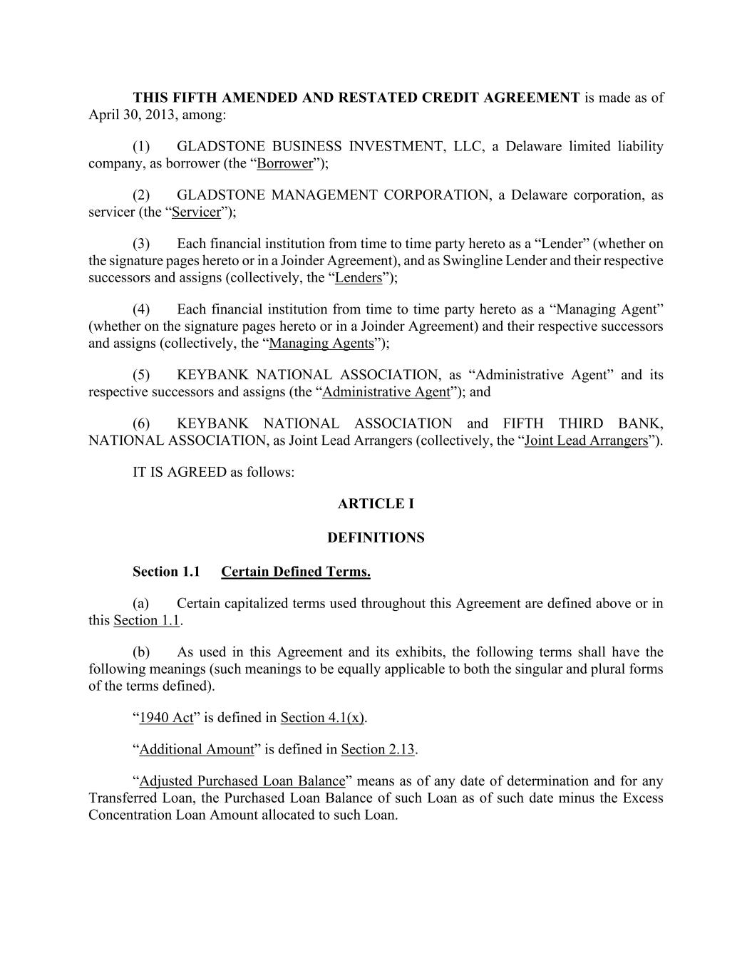 本第五份经修订和重述的信贷协议于2013年4月30日订立,其中:(1)Gladstone BusinessInvestment,LLC,一家特拉华州有限责任公司,作为借款人(“借款人”);(2)Gladstone Management CORPORATION,一家特拉华州公司,作为服务商(“服务商”);(3)每一金融机构不时作为“贷款人”(无论是在本协议的签字页上还是在共同协议中),以及作为Swingline贷款人及其各自的继任者和受让人(统称,“出借人”);(4)每一金融机构不时作为本协议的“管理代理人”(无论是在本协议的签字页上还是在联合协议中)及其各自的继任者和受让人(统称“管理代理人”);(5)KEYBANK国民协会作为“行政代理人”及其各自的继任者和受让人(“行政代理人”);(6)KEYBANK国民协会和Fifth Third BANK国民协会作为联合牵头安排人(统称“联合牵头安排人”)。议定如下:第一条定义第1.1节某些定义术语。(a)本协定通篇使用的某些大写术语在上文或本第1.1节中定义。(b)本协定及其证物中使用的下列术语应具有以下含义(这些含义应同样适用于所定义术语的单数和复数形式)。第4.1节(x)中对“1940年法案”进行了定义。“额外金额”在第2.13节中定义。“调整后的已购买贷款余额”是指截至任何确定日期,对于任何已转让的贷款,截至该日期该贷款的已购买贷款余额减去分配给该贷款的超额集中贷款金额。